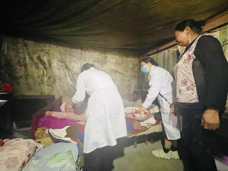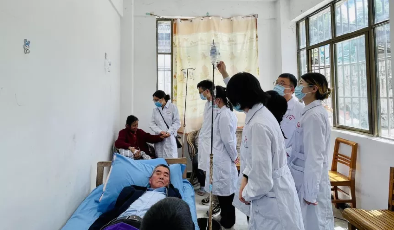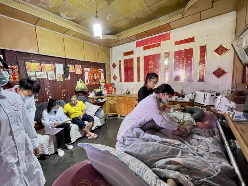 7月13日上午,在营坡社区召开座谈会后,团队成员在社区卫生室开展了对基层卫生室的实地走访,对基层医疗服务状况的调研,同时对病房中正在接受治疗的6名患者进行关心慰问。志愿团队关切的询问患者病情及不适程度,一一给出护理指导建议,并为他们精心准备了礼物。期间,志愿团队还对社区卫生室负责人开展了访谈。