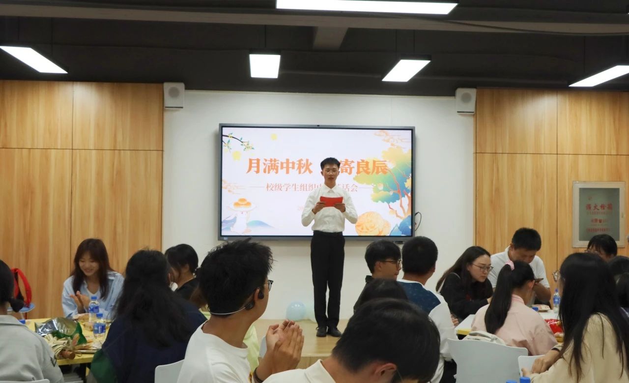 校团委副书记皮筱娟祝同学们中秋快乐,勉励各校级组织做好本职工作,同时加强交流联系、凝聚合力、共同进步。主持人介绍了中秋节的来历和习俗,同学们积极参与诗词飞花令、猜灯谜、投壶等趣味活动环节,观看了精彩的节目表演,在游戏与歌舞表演中体会到节日的快乐,也增进了各学生组织间的友谊。最后,同学们写下节日祝语,表达美好祝愿。