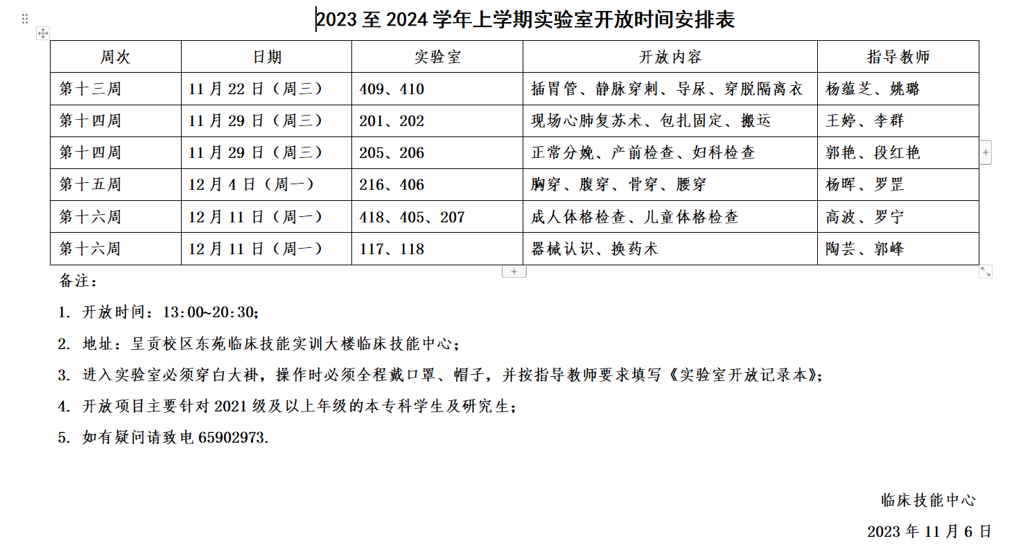 2023至2024学年上学期实验室开放时间安排表