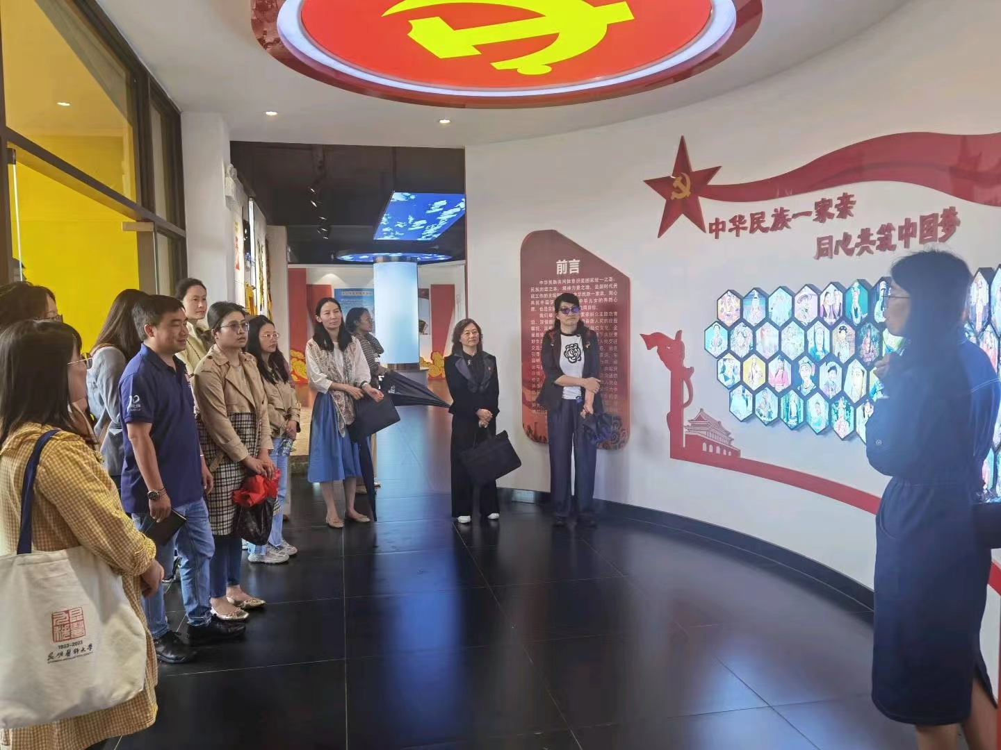 在讲解员的引领下,全体教师先后参观了“中华民族一家亲”群众主题教育馆、融荣与共实践中心、民族团结誓词碑、非遗工作室等内容,党员干部通过听觉、触觉等方式充分了解到云南多地区、多民族的特色文化习俗,不断见证了云南民族团结进步事业、云南民族团结进步示范区建设取得的新进展、新成就,深切体会铸牢中华民族共同体意识的丰富内涵和重大意义。