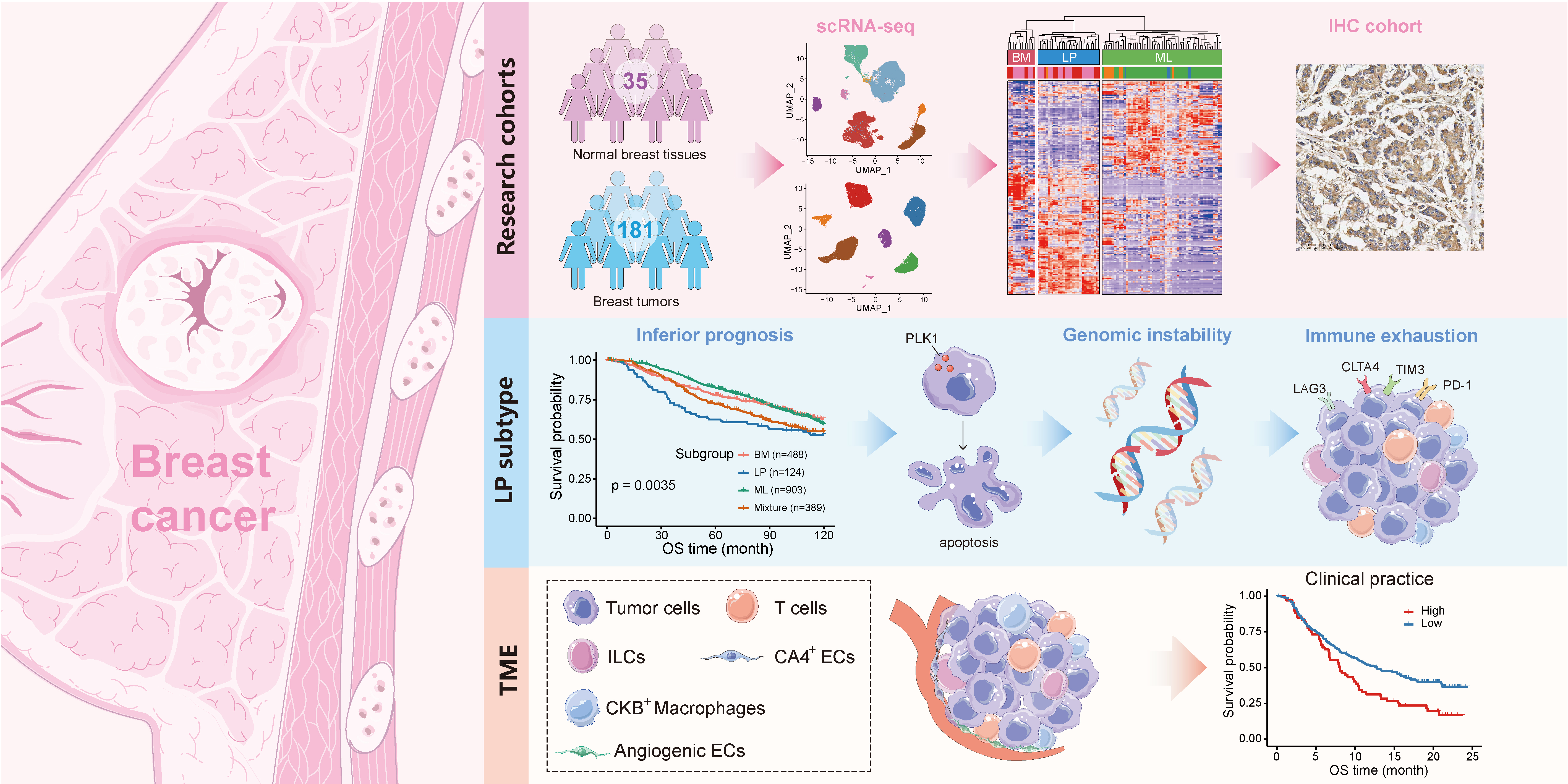 在本研究中,米兰milan官方网站、中科院昆明动物所陈策实研究员团队系统地构建了一个大规模的人类正常乳腺和乳腺癌组织的单细胞转录组图谱,以从细胞层面探索肿瘤起源。通过在单细胞水平上将乳腺癌细胞与作为参照的正常乳腺上皮细胞进行比对和映射,我们发现乳腺癌不同的肿瘤细胞起源模式。我们鉴定了一个新的乳腺癌亚型——Luminal Progenitor (LP)亚型乳腺癌。LP亚型乳腺癌以基因组不稳定性和免疫抑制性微环境为显著特征,且预后明显较差,但对新辅助化疗、PARP 抑制剂和免疫治疗更加敏感。通过多组学分析和体内外实验,我们筛选并验证了PLK1是参与LP亚型乳腺癌染色体不稳定的关键成分,可以作为LP 亚型乳腺癌的潜在治疗靶点。此外,我们在该乳腺癌单细胞转录组图谱中鉴定了多个与临床预后和治疗反应相关的罕见免疫和基质细胞亚群。总的来说,这一研究不仅提供了一个大规模的正常乳腺和乳腺癌组织的单细胞图谱,而且为从肿瘤起源的角度深入解析乳腺癌异质性提供了全新的科学见解,并为临床治疗提供新的思路和方法。