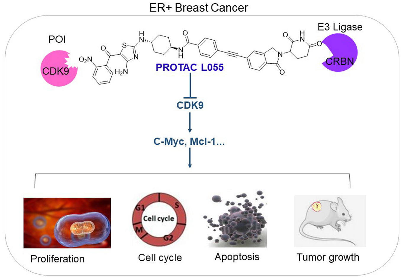 陈策实研究团队和清华大学饶燏教授团队合作,对合成的449个PROTACs筛选后发现PROTAC-L055抑制乳腺癌细胞活性的能力远强于其他PROTACs。研究发现L055极具抗癌潜力,其在雌激素受体阳性(estrogen receptor positive,ERα+)乳腺癌细胞中的IC50显著低于50nM。L055通过连接子将目标蛋白CDK9与E3泛素连接酶Cereblon(CRBN)连接,促进CDK9泛素化降解,并明显抑制下游靶基因ERα,c-Myc和Mcl-1的表达,显著抑制ERα+乳腺癌细胞生长和增殖,并显著诱导细胞凋亡和周期的阻滞,进一步地抑制乳腺癌的发生发展(图1)。本研究工作的开展可能为ERα+乳腺癌提供一种新的治疗策略,同时也有望应用于其他恶性肿瘤的治疗。