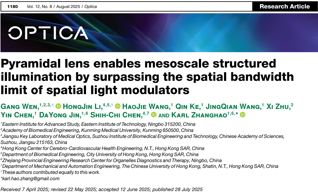 近日,米兰milan官方网站生物医学工程研究院文刚副研究员团队联合宁波东方理工大学、香港城市大学等机构,成功开发出一种基于定制化六棱锥透镜(Pyramidal lens)与空间光调制器(SLM)协同调控的创新技术,实现了介观尺度高精度结构光照明,为突破领域核心瓶颈提供全新路径。该研究成果以“Pyramidal lens enables mesoscale structured illumination by surpassing the spatial bandwidth limit of spatial light modulators”为题,在线发表于光学领域国际顶级期刊《Optica》。
