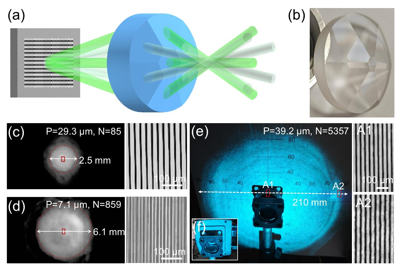 针对这一难题,研究团队从摄影分影镜头中汲取灵感,创新性提出了“SLM+六棱锥透镜”协同调控的介观尺度结构光照明方法:通过将定制化六棱锥透镜置于SLM后方,可将±1级衍射光束偏折至更大角度,使原本仅能生成数百根条纹的SLM即刻产生成千上万根精细条纹。棱锥透镜的这种“放大”效应,将SLM的等效像素数提升了2-5个数量级。与此同时,该方案完整保留了SLM对条纹方向、周期和相移进行快速、精准、灵活调控的能力。实验证实,仅使用短边1024像素的SLM,即可生成包含约5357根条纹、实现6步移相的大视野结构光照明,系统SBP较传统方法提升高达246倍。这种介观尺度的结构光照明传统方法需使用具有数万像素的SLM,远非当前商用产品所能企及