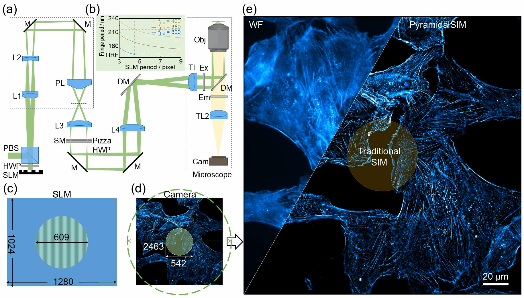 进一步,研究团队将该方案部署至结构光照明超分辨显微镜(SIM)系统,构建了新型大视野SIM显微镜——PyramidalSIM。该系统仅利用SLM上直径约609像素的小光斑,即可实现充满2K像素sCMOS相机全靶面的有效SIM照明,最终获得具有两倍分辨率的4K级多色超分辨图像。