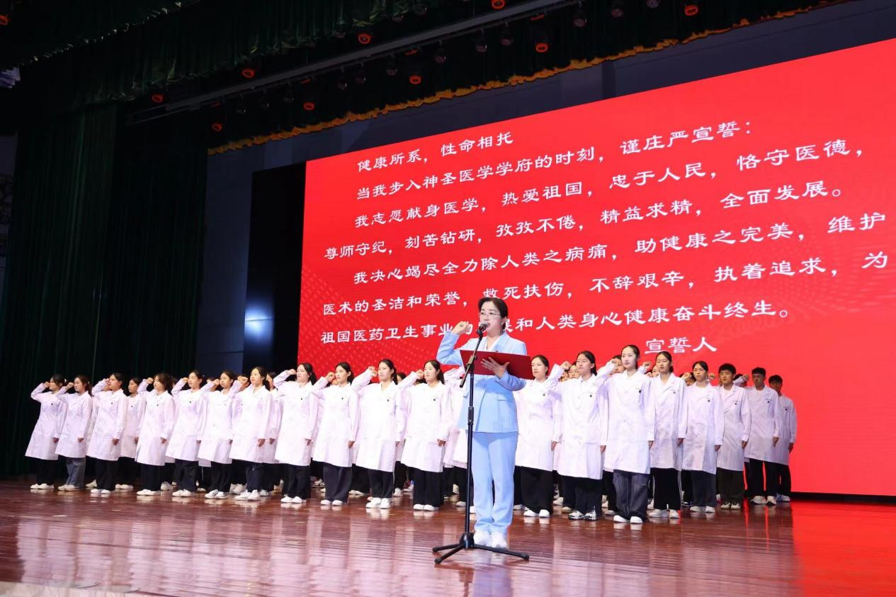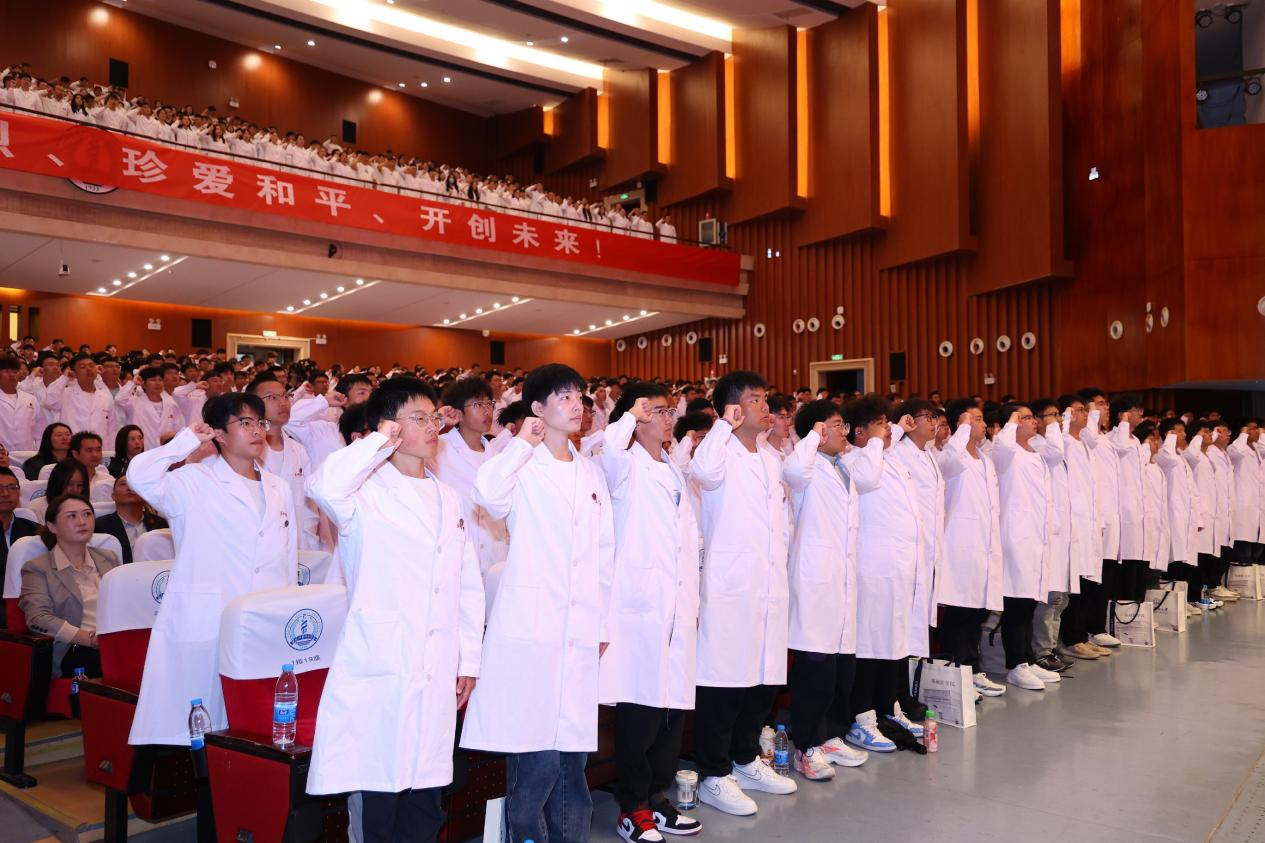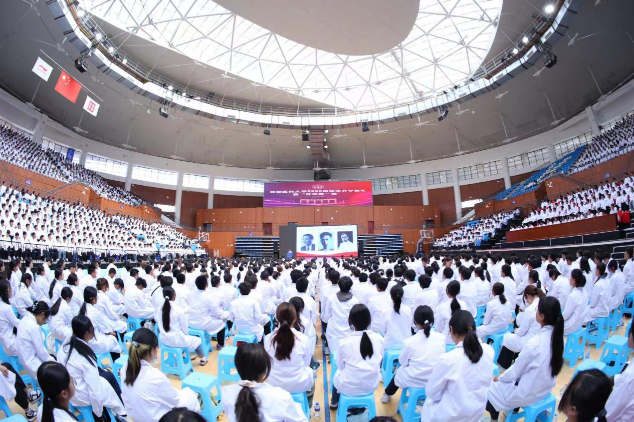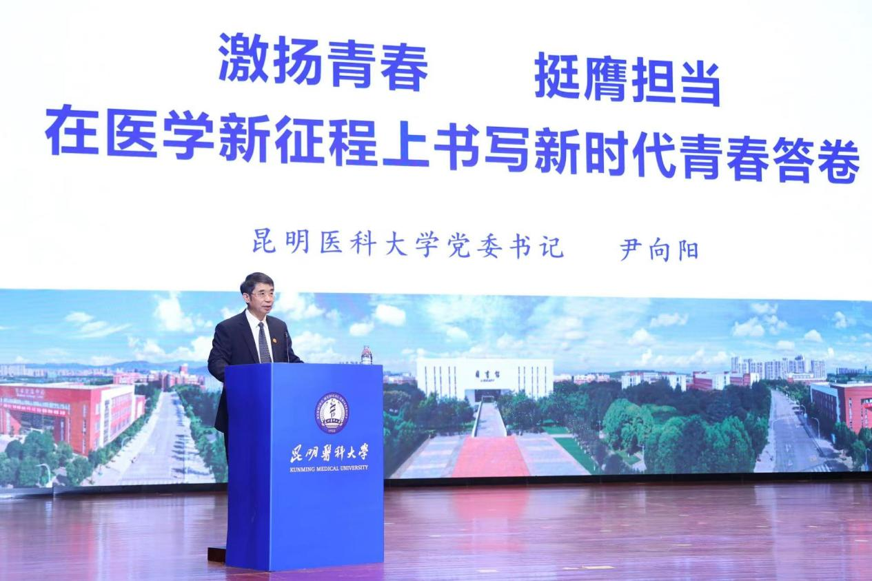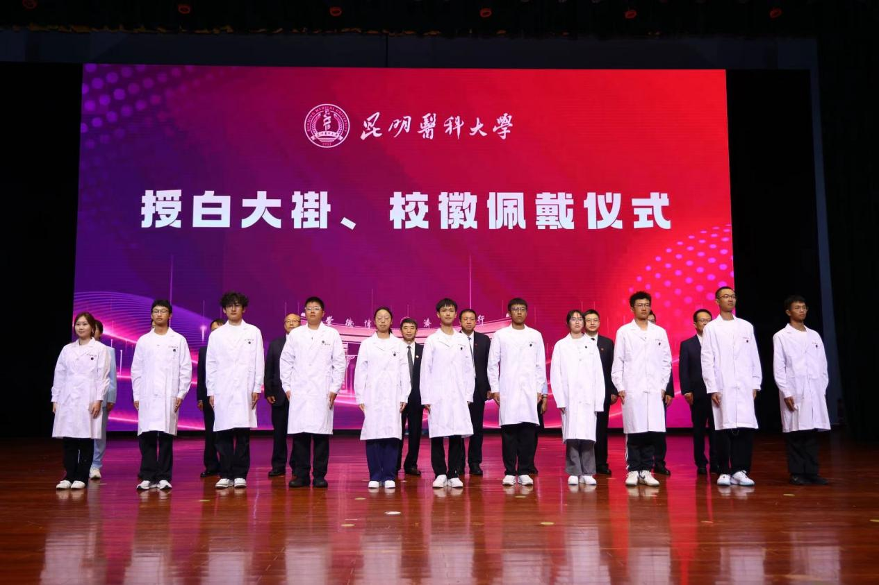 典礼上,校领导为新生代表授白大褂、佩戴校徽,并祝贺全体新生成为最年轻的“昆医人”。