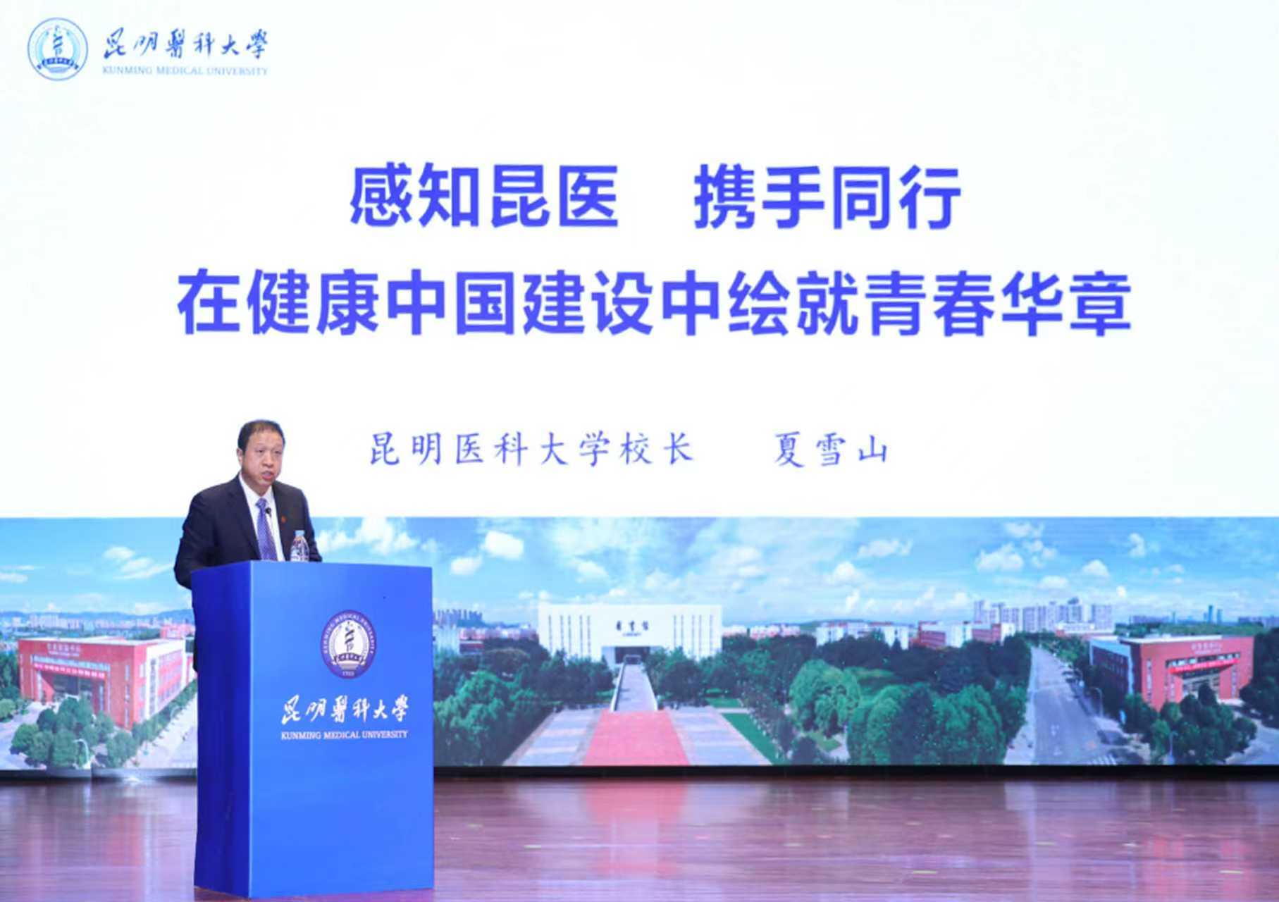 校长夏雪山在开学典礼上以“感知昆医 携手同行 在健康中国建设中绘就青春华章”为题,与新生交流探讨了“如何从昆医九秩历史中汲取精神力量”“如何在百年变局中锚定医学教育的时代坐标”“如何以青春之我共筑医学强国梦想”。夏雪山通过对“KMU”3个字母的深化释义,生动诠释了米兰milan官方网站的精神基因。面对新时代医学教育何为的问题,他从医学面临的机遇与挑战、昆医服务国家需求,培养时代医者作了解答。他希望同学们:一要坚守圆心,以医学生誓言锚定人生航向。二要延伸半径,以多维能力拓展人生领域。三要点连周长,以“青春有为”的作答成就强国梦想。