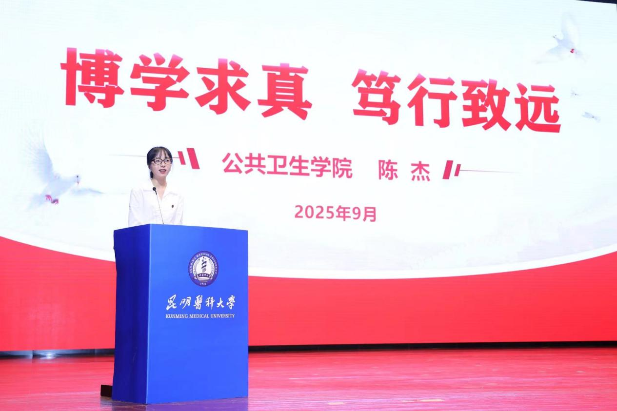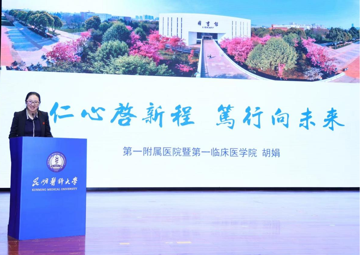 胡娟分享了在昆医学习、工作的经历,她勉励新生:一要锤炼“崇德博学”的扎实学风,让求知成为习惯;二要永葆“仁医仁术”的炽热情怀,让温度照亮医学;三要做好“志存高远”的成长规划,让青春不负时代;四要珍惜“团结奋进”的同窗情谊,让身心健康成长。
