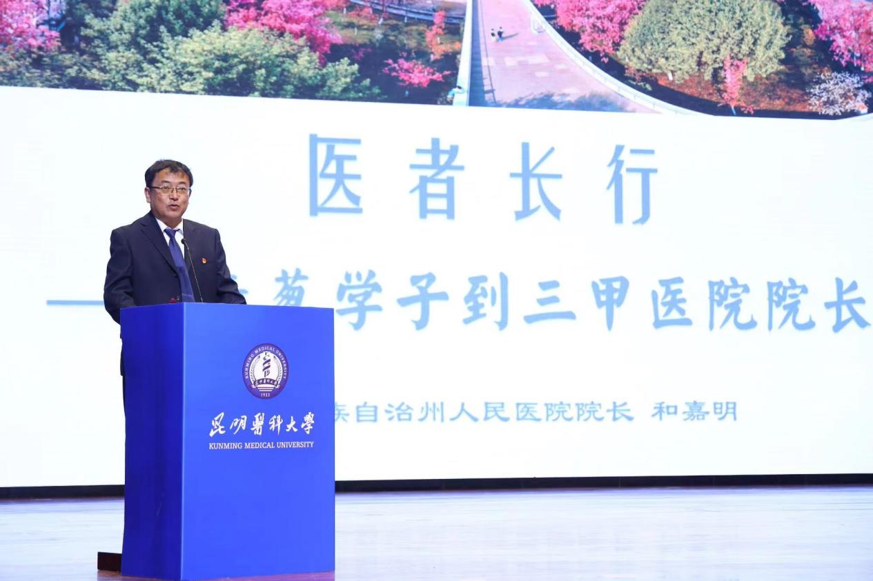和嘉明深情讲述了在昆医学习成长的点滴,并介绍了自己在基层医疗机构的工作情况和医院的发展建设历程。他说:“母校将是你们最坚实的根基,她给予我们的不仅是安身立命的知识技能,更是受益终身的精神财富和前进力量。无论你们来自何方,无论你们曾面临何种困难,在这里,都能找到属于自己的光芒。”