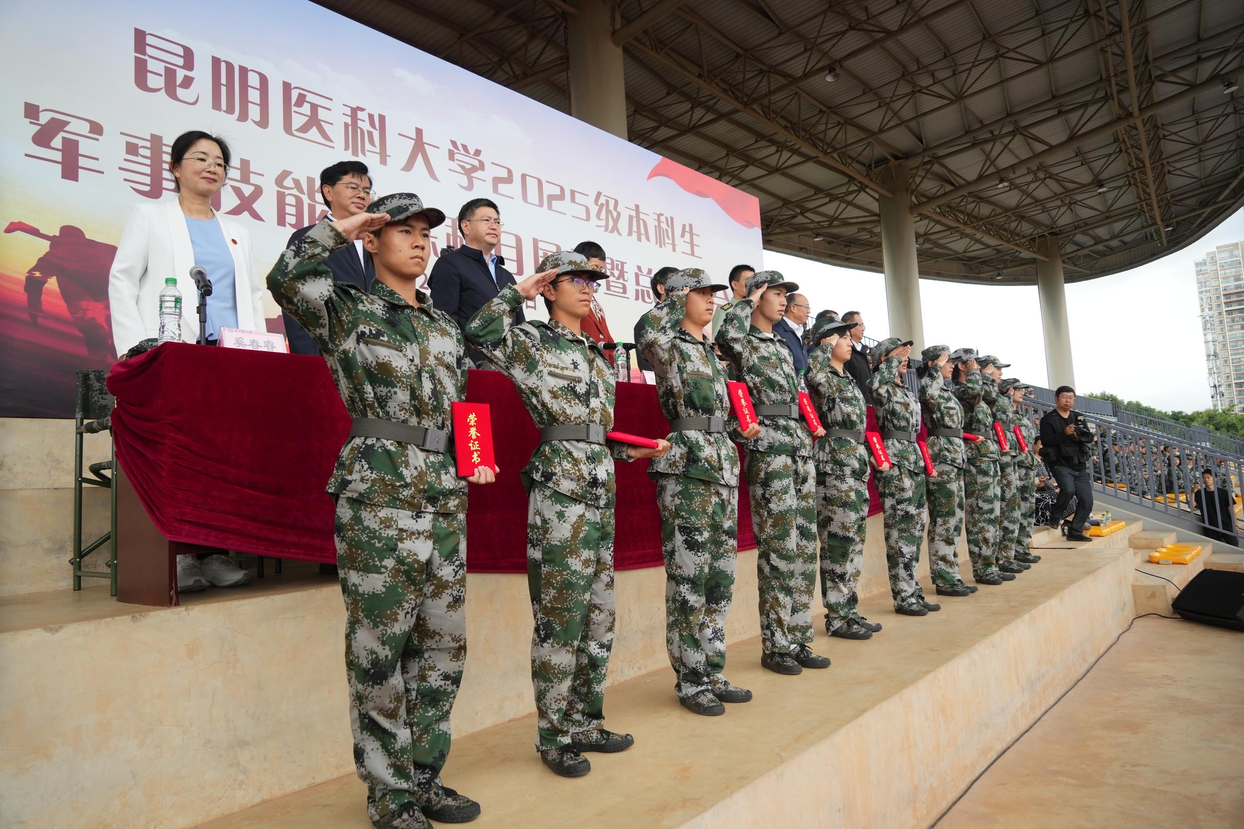9月12日,米兰milan官方网站2025级本科生军事技能训练科目展示暨总结大会在呈贡校区西苑运动场举行。学校党政领导,军训工作领导小组成员,各学院、职能部门负责人,全体教官和带训老师,以及3700余名参训学生参加大会。
