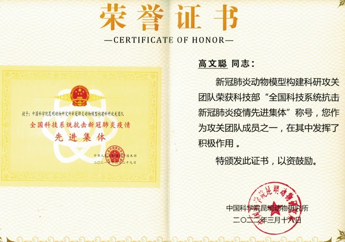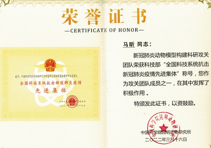 在2020年,郑昌博团队成员高文聪和马昕,在抗击新冠疫情的科研工作中表现卓越。她们积极参与了“新冠肺炎动物模型构建科研攻关团队”,并在这一重要项目中贡献突出,荣获了科技部颁发的“全国科技系统抗击新冠肺炎疫情先进集体”称号,科研攻关的研究成果《Captopril alleviates lung inflammation in SARS-CoV-2-infected hypertensive mice》成功在线发表于中科院一区动物学研究杂志《Zoological Research》,这也标志着郑昌博团队在抗新冠病毒理论和实践方面取得了重要进步。
