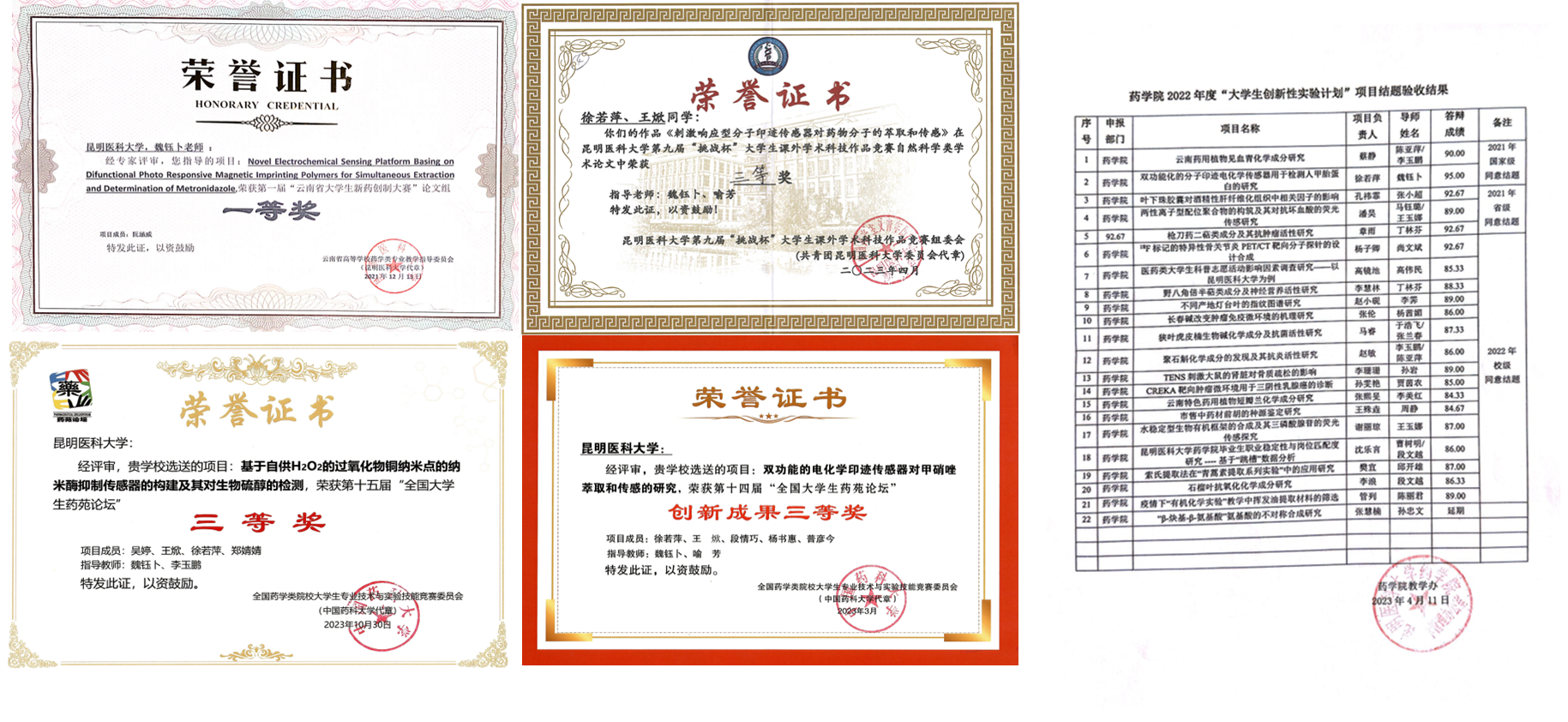 她指导的本科生们也不负众望,荣获多个奖项。其中,3名同学获得国家级大学生创新创业训练计划项目并顺利结题(优秀),1名同学荣获“云南省大学生新药创制大赛”一等奖,5名同学荣获第十四届全国大学生“药苑论坛”创新成果奖三等奖,4名同学荣获第十五届全国大学生“药苑论坛”三等奖。