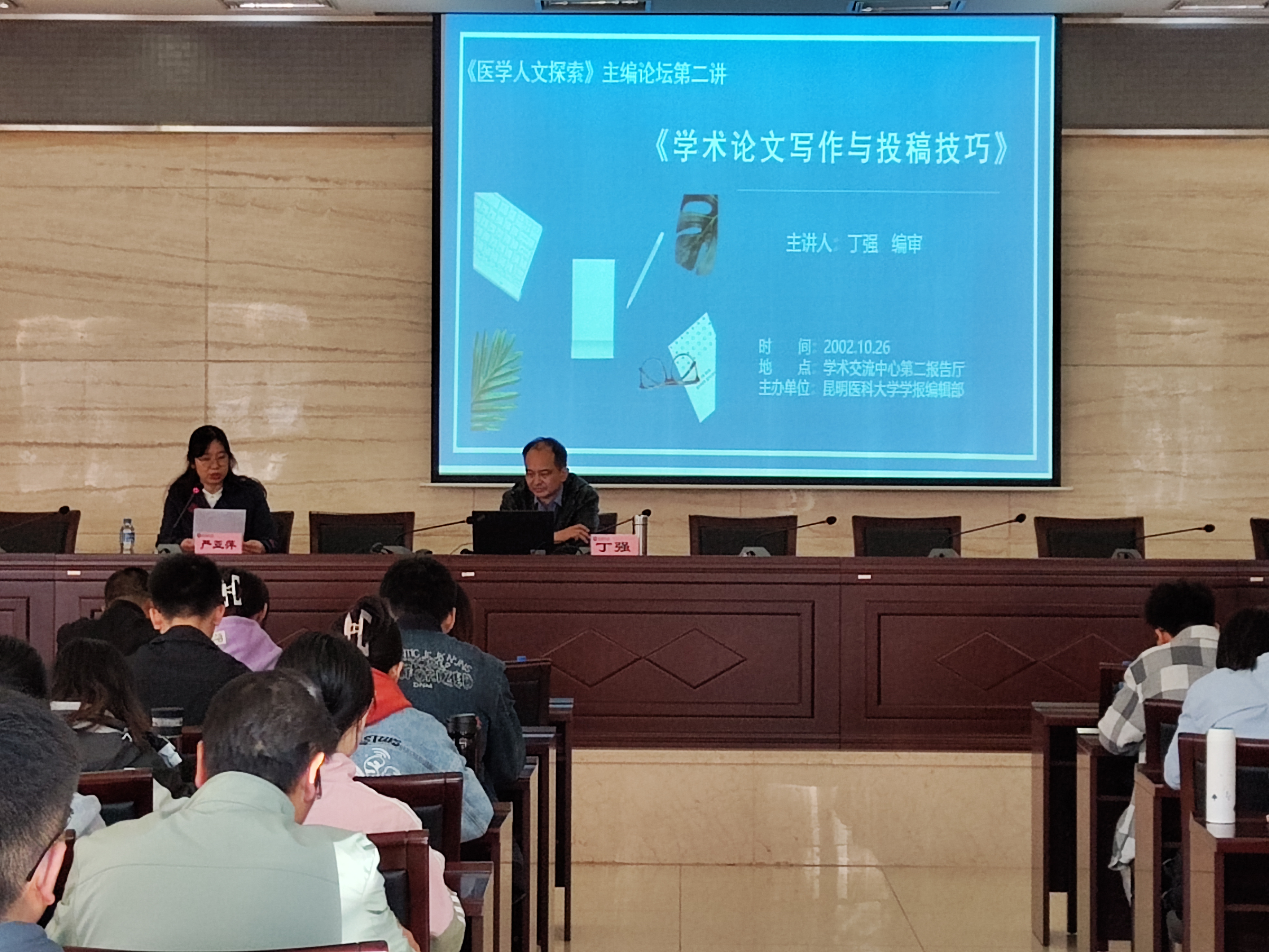 10月6日上午,由学报编辑部主办的《医学人文探索》主编论坛第二讲在学术交流中心第二报告厅举行,邀请云南开放大学常务副主编丁强教授作了题为《学术论文写作和投稿技巧》专题讲座。学校人文学院、马克思主义学院、护理学院、公共卫生学院、直属党委、研究生院等从事社科研究的师生共计140余人聆听了讲座。