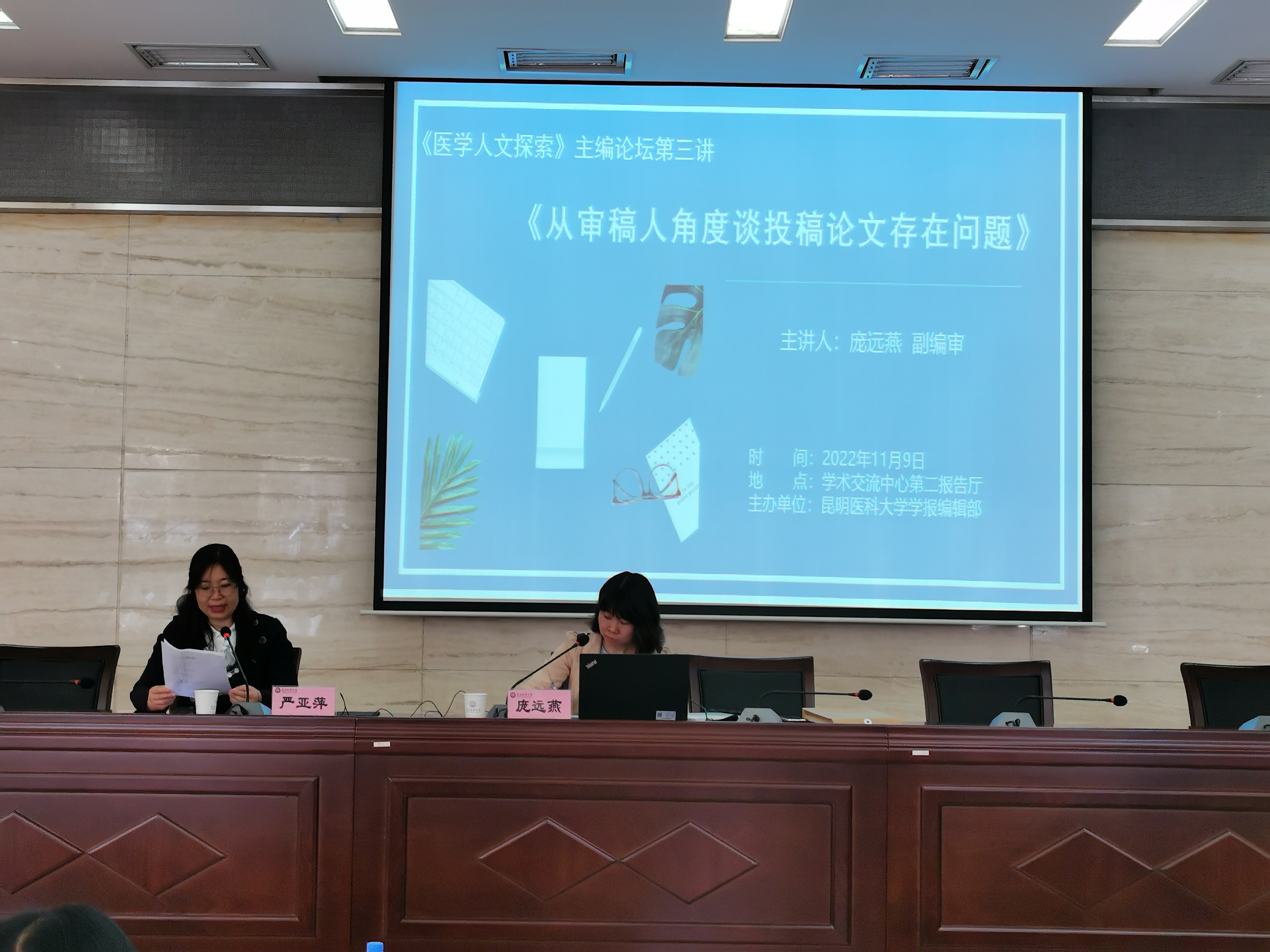 11月9日上午,由学报编辑部主办的《医学人文探索》主编论坛第三讲在学术交流中心第二报告厅举行,邀请《学园》杂志执行主编庞远燕副编审作了题为《从审稿人角度谈投稿论文存在的问题》专题讲座。学校马克思主义学院、研究生院、直属单位等从事社科研究的师生共计60余人聆听了讲座。