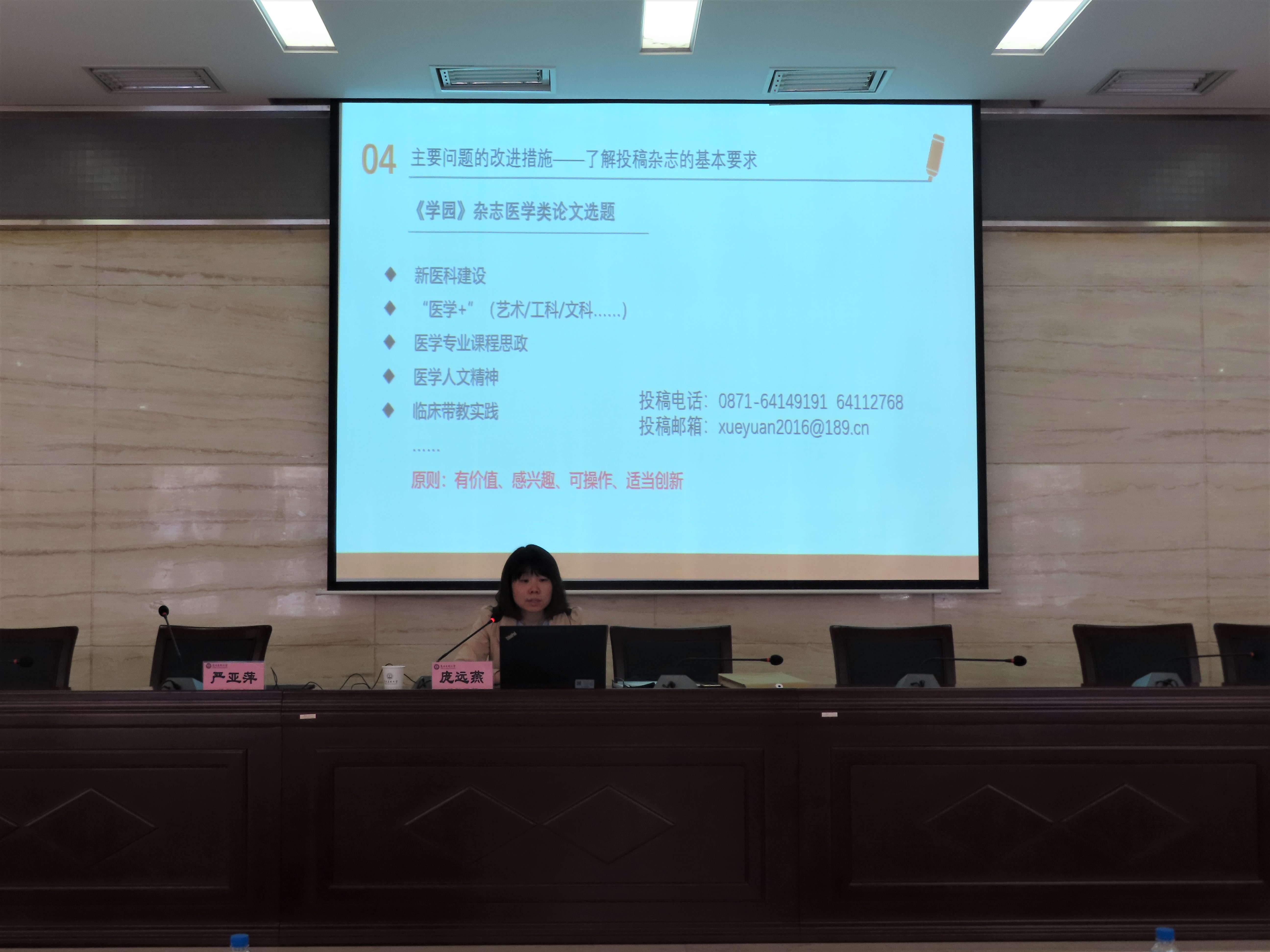 她从《学园》的定位、投稿的要求、重点栏目简介;学术论文审稿中发现的问题;医学类学术论文存在的问题;主要问题的改进措施四个方面作了详细的讲授。讲授内容丰富、 目标清晰,分析精辟,很接地气,也有较强的针对性和可操作性,对于我们提升学术论文写作能力,提高投稿命中率具有很强的指导意义,也拓宽了学术论文投稿的渠道。在互动环节,庞老师解疑答惑,有的方式的进行了解答,增强了沟通和理解,实现了作者和编辑的换位思考。