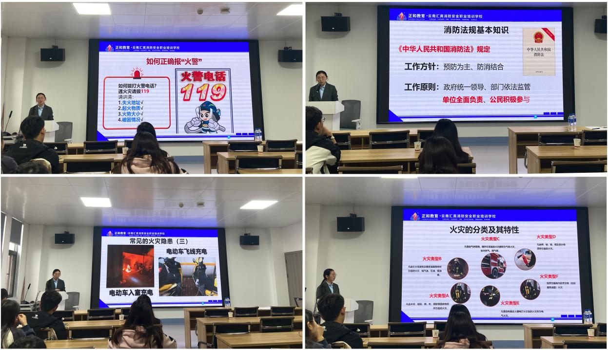 在培训会上,詹欢结合科研实验室的实际情况,围绕电气设备使用、危化品储存、气体钢瓶管理等重点环节,运用高校真实火灾案例,详细讲解了实验室火灾隐患及预防措施。同时,针对实验室可能发生的各类火灾,讲授了科学应对方法和火场疏散逃生技巧,并现场系统介绍了不同灭火器材的适用场景及操作要点,强调了“一拉二压三喷”的干粉灭火器操作口诀,以及二氧化碳灭火器防冻伤注意事项和消防栓等设备的正确使用方法,帮助师生熟悉火灾应急处置流程。