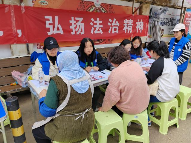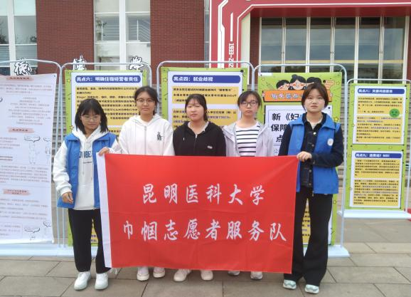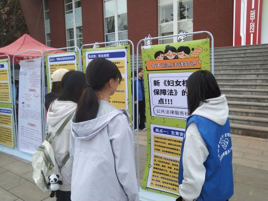 巾帼志愿者服务队在学校呈贡校区学生会堂前开展了普法长廊活动,活动包含法律知识问答、参观普法长廊、横幅签字留念三项内容。其中,普法长廊主要围绕我国新修订的《中华人民共和国妇女权益保障法》的九大亮点进行展示,并由志愿者对主要内容向广大师生展开讲解。