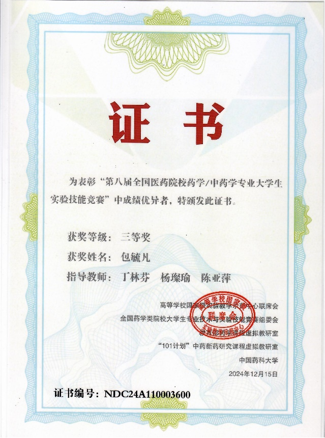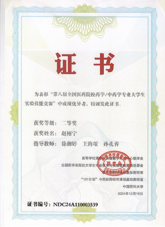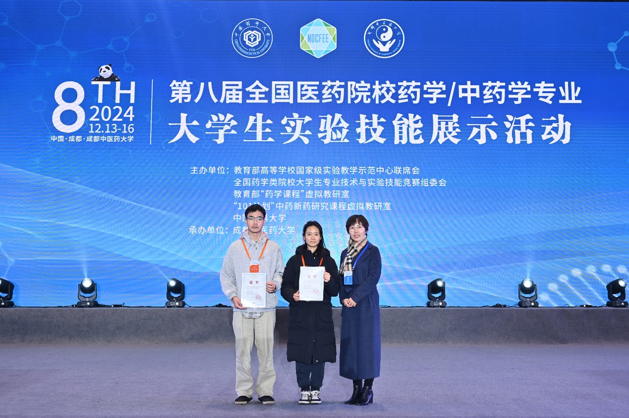 2024年12月14-15日,由教育部高等学校药学类专业教学指导委员会、高等学校国家级实验教学示范中心联席会药学学科组主办的“第八届全国医药院校药学/中药学专业大学生实验技能竞赛”在成都中医药大学如期举行。来自北京大学、复旦大学、中国药科大学、海军军医大学等148所医药院校的288名学生代表参加了本次竞赛。我院选拔的两名同学2022级临床药学专业赵栩宁(指导老师:徐湘婷、王海垠、孙孔春)和2022药学专业包毓凡(指导老师:丁林芬、杨璨瑜、陈亚萍)分别获得二等奖和三等奖。