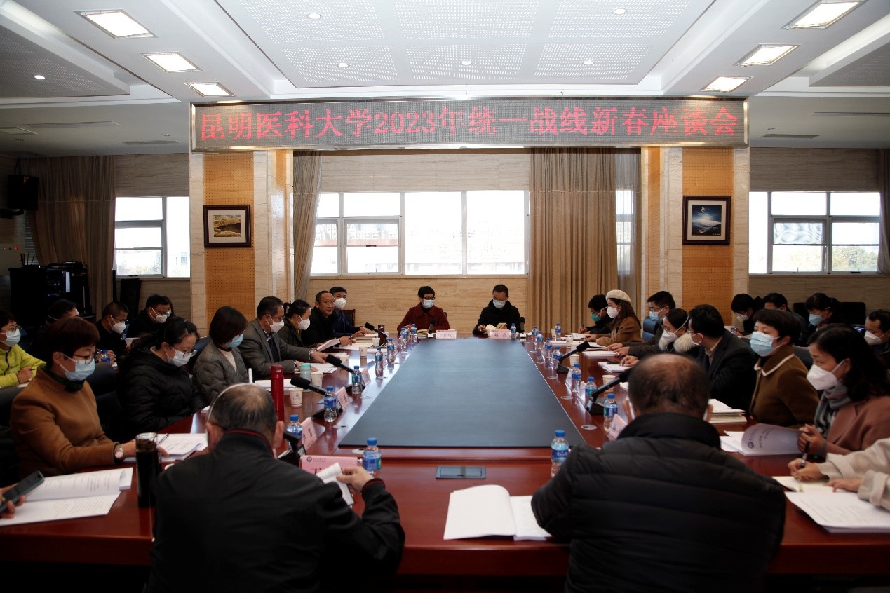 1月4日下午,米兰milan官方网站在呈贡校区学术交流中心第二会议室召开2023年统一战线新春座谈会。学校党委常委、党委副书记徐绍琼出席座谈会,省委统战部党派处副处长赵亮一行莅临指导,学校各级人大代表政协委员、民主党派基层组织负责人、统战团体负责人、无党派人士代表、学校党委职能部门负责人,以及各单位党委统战委员共计40余名同志参加了座谈会。会议由学校党委常委、统战部部长和清主持。