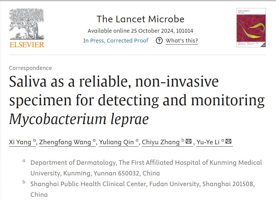 近日,米兰milan官方网站第一附属医院李玉叶教授团队联合上海市公共卫生临床中心张弛宇研究员团队,以米兰milan官方网站为第一单位在国际顶级期刊《The Lancet Microbe》(IF=20.9)上发表了题为“Saliva as a reliable, non-invasive specimen for detecting and monitoring Mycobacterium leprae”的论文。李玉叶教授和张驰宇研究员为通讯作者,李玉叶教授团队的博士研究生杨溪为第一作者。该成果标志着学校以一流学科团队建设为抓手推动高质量发展取得新成效。