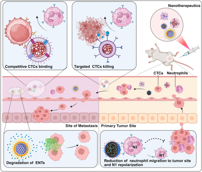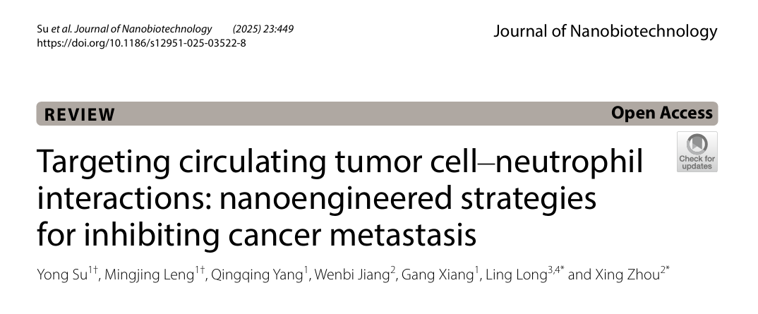 Su Y,Leng M,Yang Q,Jiang W,Xiang G,Long L,Zhou X.Targeting circulating tumor cell-neutrophil interactions: nanoengineered strategies for inhibiting cancer metastasis.J Nanobiotechnology.2025 Jun 17;23(1):449.