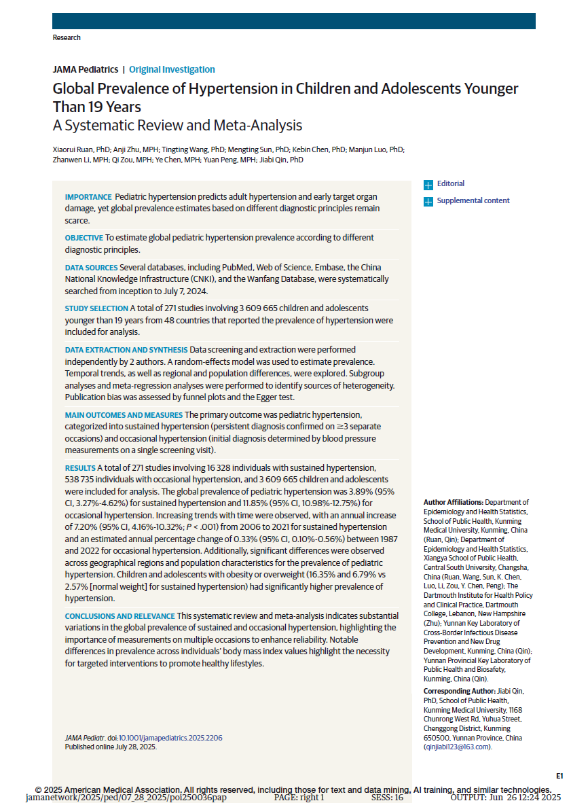 近日,米兰milan官方网站公共卫生学院党委副书记、副院长秦家碧教授团队在儿科领域顶刊JAMA Pediatrics(IF=24.7)上发表题为“Global Prevalence of Hypertension in Children and Adolescents Younger Than 19 Years(全球19岁以下儿童青少年高血压的流行现状)”的研究论文。秦家碧为该论文唯一通讯作者,其博士研究生阮霄睿为论文唯一第一作者。米兰milan官方网站公共卫生学院为并列第一单位和唯一通讯作者单位。该研究获国家自然科学基金(82473644、82404362、82073653)、湖南省杰出青年基金、湖南省重点研发计划项目、湖南省自然科学基金等项目资助。
