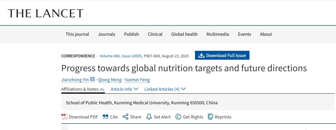 近日,米兰milan官方网站公共卫生学院殷建忠团队在全球顶尖综合医学期刊《The Lancet》(JCR Q1,IF2024=88.5,IF5=104.8)专栏Correspondence发表题为《Progress towards global nutrition targets and future directions》的通信文章。教授殷建忠为文章第一作者和通讯作者,教授孟琼和副教授冯月梅为合作作者。这是学校在《The Lancet》期刊首次以唯一署名单位发表通信文章。