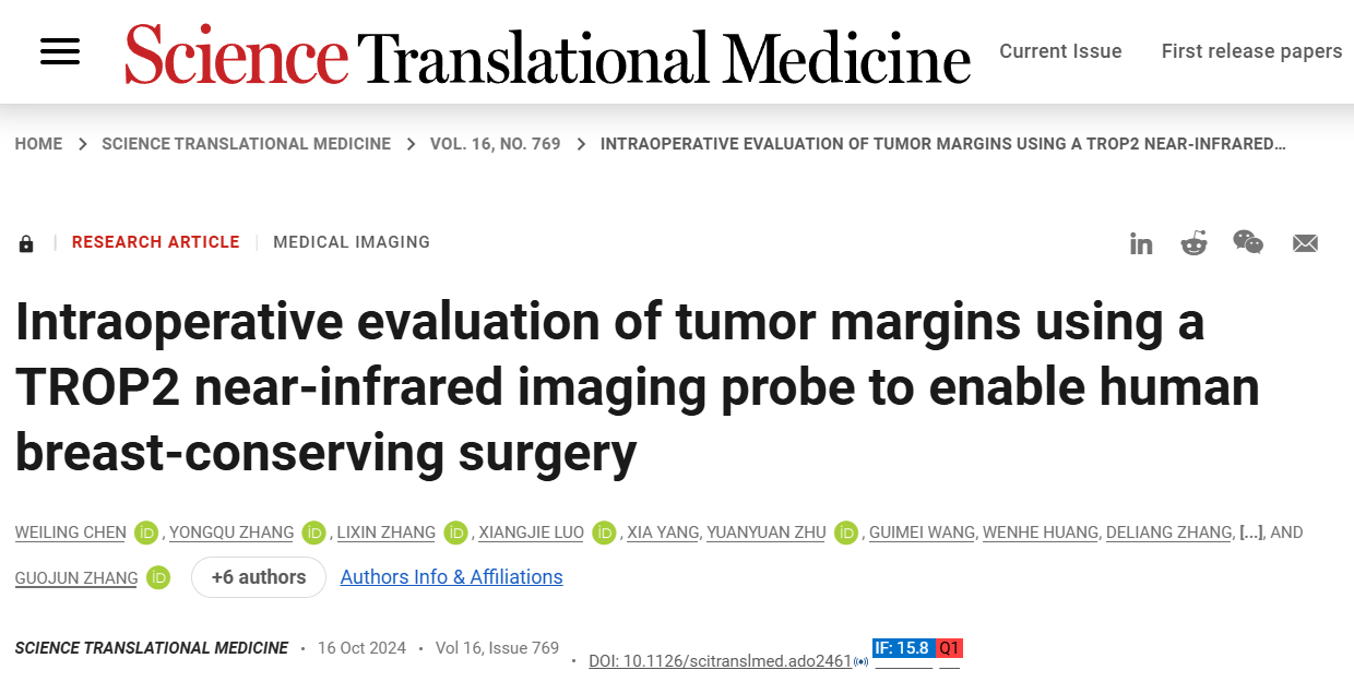 近日,米兰milan官方网站第三附属医院张国君教授作为唯一通讯作者在Science子刊《Science Translational Medicine》(影响因子15.8分)发表了题为Intraoperative evaluation of tumor margins using a TROP2 near infrared imaging probe to enable human breast-conserving surgery的研究论文。张国君教授团队的博士研究生陈伟玲、硕士研究生张莉欣、汕头大学医学院附属肿瘤医院张永渠教授为论文的共同第一作者。该研究成果标志着学校在组织实施科技工作高质量内涵式发展方面取得了重要进展。