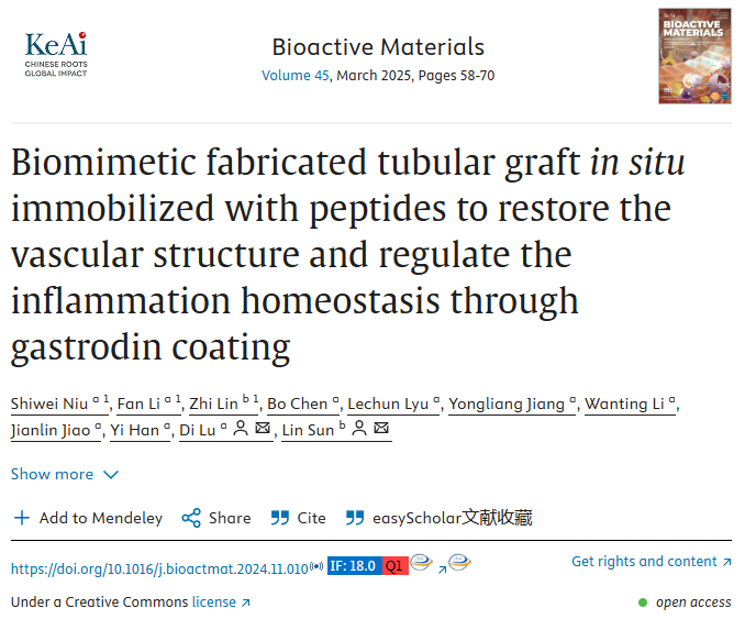 近日,米兰milan官方网站第二附属医院孙林教授团队以米兰milan官方网站为第一单位在Bioactive Materials(一区Top,IF=18.0)期刊上发表了题为“Biomimetic Fabricated Tubular Graft In Situ Immobilized with Peptides to Restore the Vascular Structure and Regulate the Inflammation Homeostasis Through Gastrodin Coating”的科研论文。孙林为论文通讯作者,米兰milan官方网站康复学院暨云南省干细胞与再生医学重点实验室副教授牛世伟、实验员李璠以及第二附属医院心内科博士林志为论文第一作者。该研究工作得到了国家自然科学基金、云南省科技厅—米兰milan官方网站联合专项和昆明市科技局创新中心重大项目的资助。