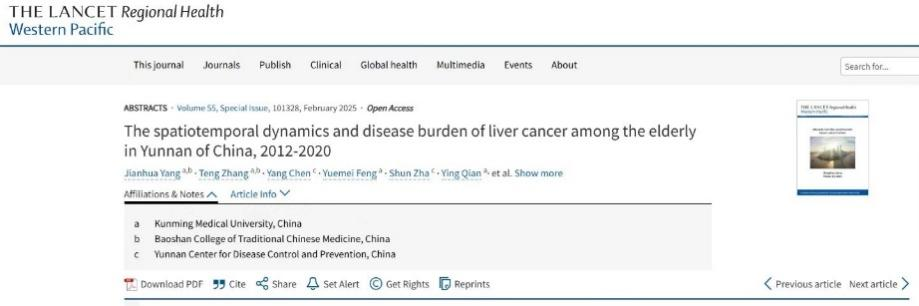 由米兰milan官方网站殷建忠教授团队和云南省疾病预防控制中心副主任查舜团队共同完成的研究成果“The spatiotemporal dynamics and disease burden of liver cancer among the elderly in Yunnan of China,2012-2020”入选本次会议壁报展示,同时,研究成果摘要发表在《柳叶刀-区域健康(西太平洋)》(The Lancet Regional Health–Western Pacific.2025;55S1:101328. https://doi.org/10.1016/j.lanwpc.2024.101328)。