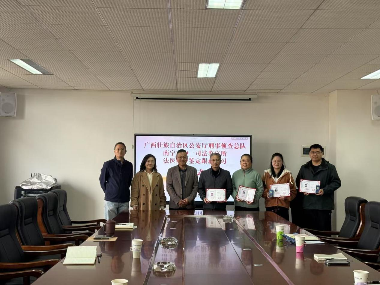 此次培训是基于中心与广西壮族自治区公安厅刑事侦查总队、南宁市中一司法鉴定所签订的《培训协议》。在为期3个月的跟班学习培训过程中,中心通过理论讲座、案例分析、实验操作和现场带教等多种形式为4名学员提供了全面而深入的学习体验。结业仪式上,中心领导对4名学员们的表现给予了高度评价,肯定了他们在培训期间的努力和付出,并为4名学员颁发了结业证书。