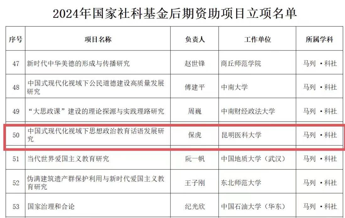 近日,全国哲学社会科学工作办公室正式公布了2024年国家社科基金后期资助项目立项名单。米兰milan官方网站马克思主义学院教授保虎申报的《中国式现代化视域下思想政治教育话语发展研究》获批立项。这是学校首次获得国家社科基金后期资助项目,也是学校近几年申报国家级人文社科项目的又一次突破。