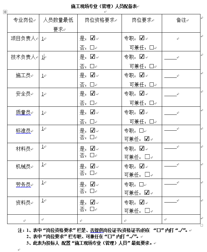 人员配备要求:详见《施工现场专业(管理)人员配备表》。
