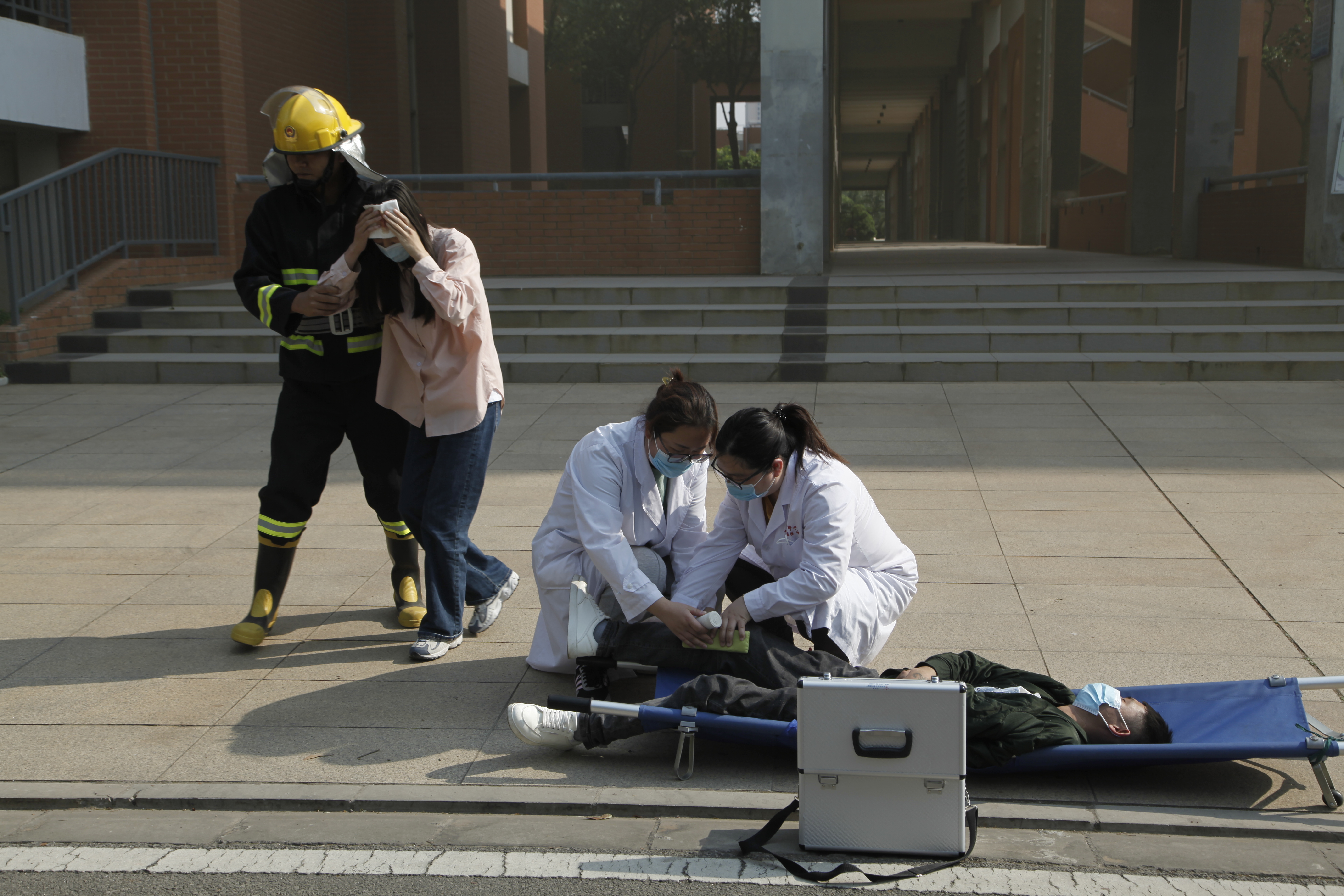 16时30分,指挥长宣布“演训开始”,报警信号和地震音效随即响起,正在上课的教师迅速组织学生护头躲避在课桌、坚固物体下进行紧急避震;同时,学校立即启动应急响应机制,指挥应急救援分队、校医院救护组迅速赶赴现场;约1分钟后,在上课教师和辅导员的带领下,全体人员迅速、有序地撤离至安全地带;应急救援分队携带搜救器材奋力搜救受伤被困人员;校医院救护组对伤员紧急包扎救治和转运;演训结束后,指挥长进行了讲评,总结经验,指出存在问题。
