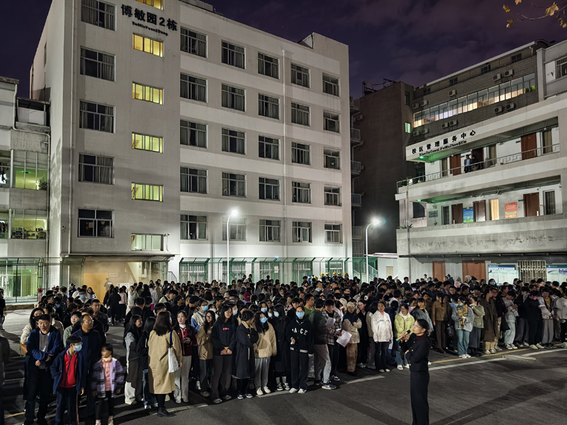 19时00分,按既定方案,学生宿舍1、2、3栋涌出滚滚浓烟,随即警报声响起,消防逃生演练拉开序幕。同学们在老师的组织下,捂住口鼻,快速、有序地从宿舍向操场安全地带疏散。到达安全地带后,迅速清点人员,确保每位学生的安全撤出火灾区域。