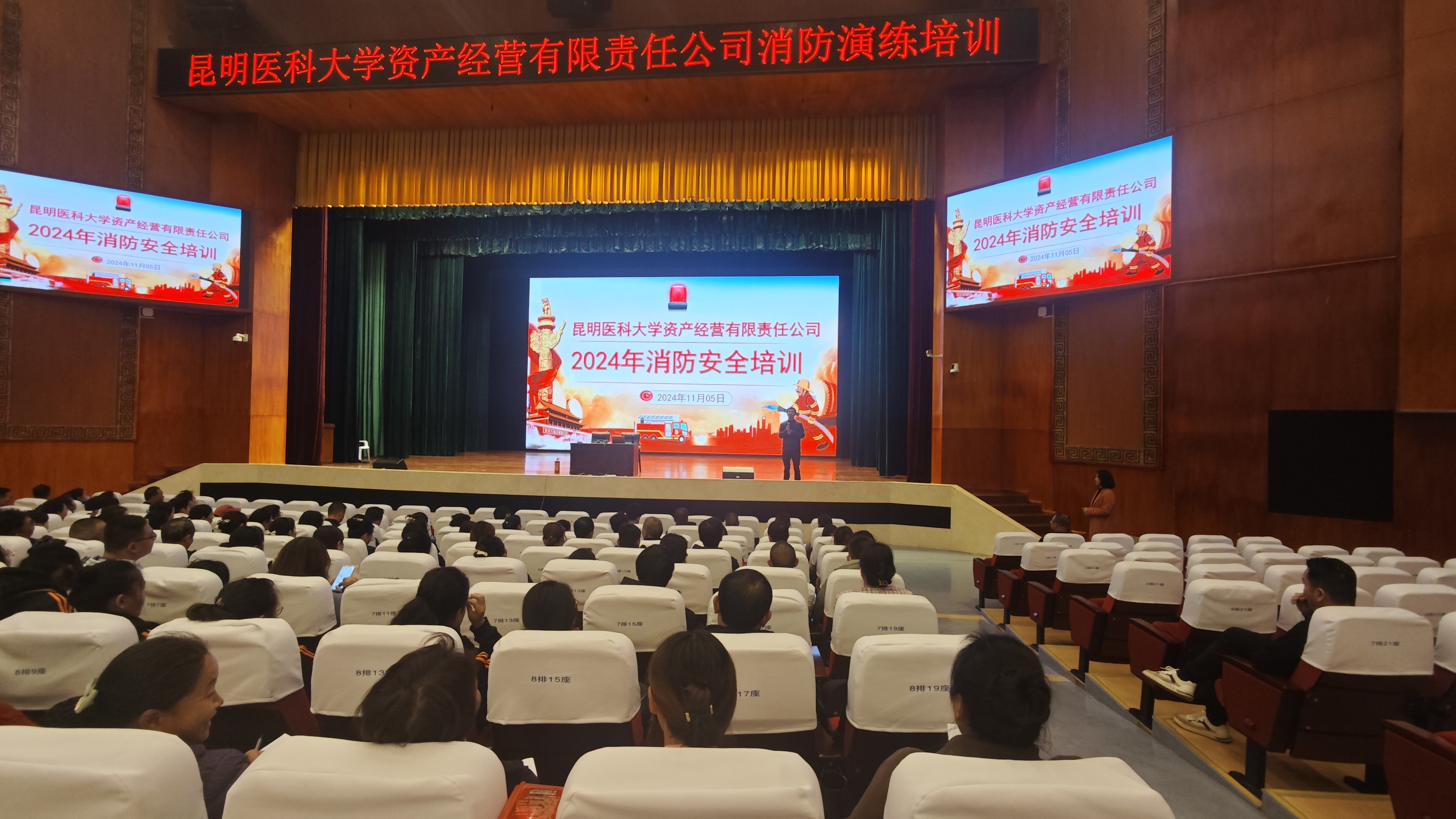 11月5日,资产经营有限责任公司和保卫处联合开展消防培训演练,保卫处处长王承全、资产公司副总经理杨俊芬以及保卫处消防科工作人员现场指导,资产经营有限责任公司各部门工作人员近120余人参训。