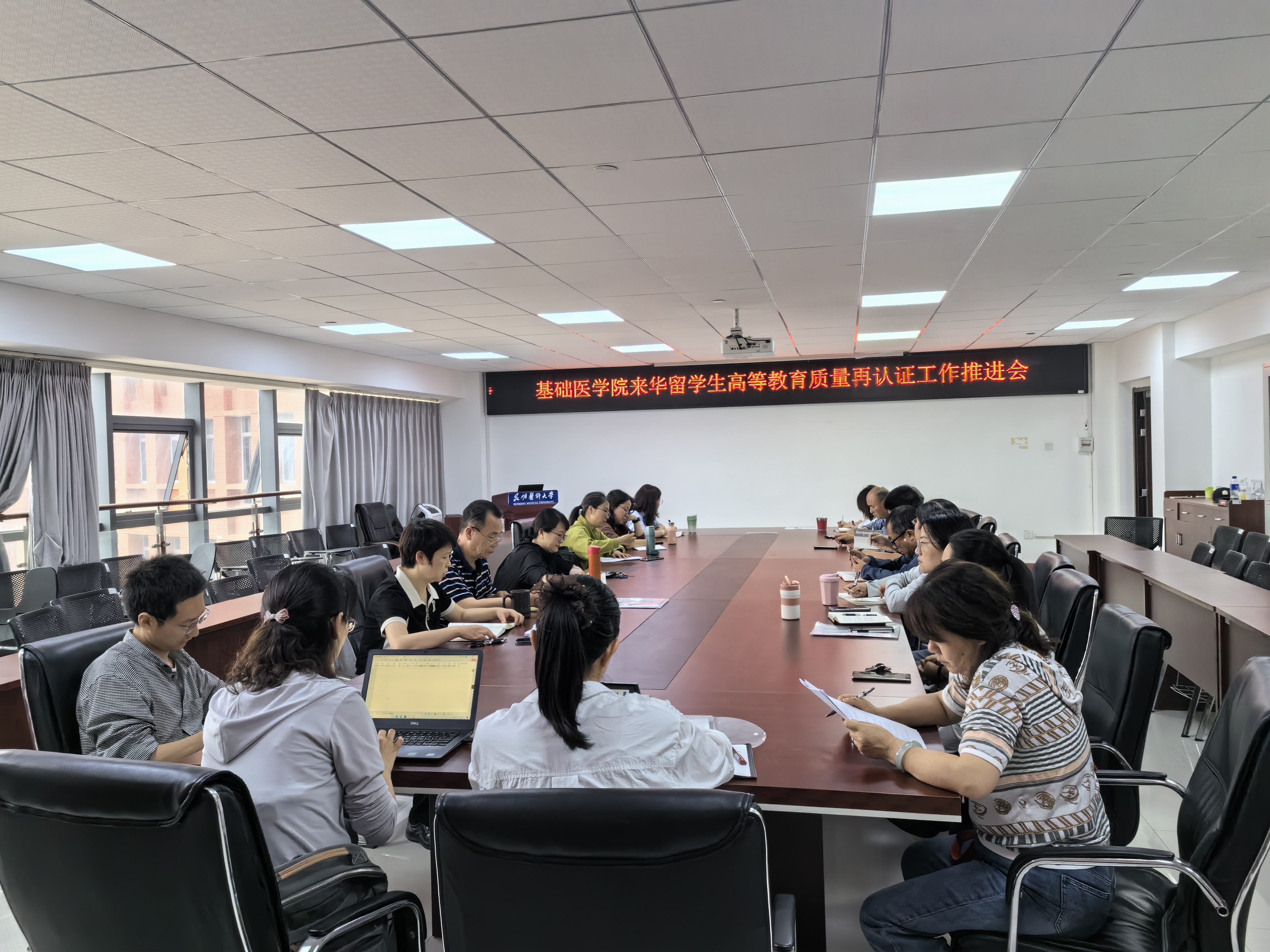 2024年5月30日上午,基础医学院在基础医学楼614会议室召开基础医学院来华留学生高等教育质量再认证工作推进会,对学院近期来华留学生高等教育质量再认证工作进行再安排、再部署、再推进。学院党政领导、各部门负责人参加会议。