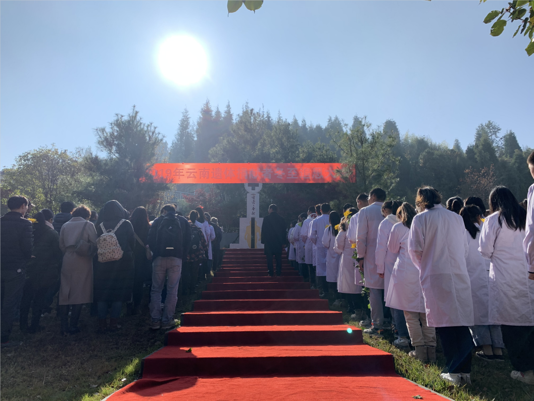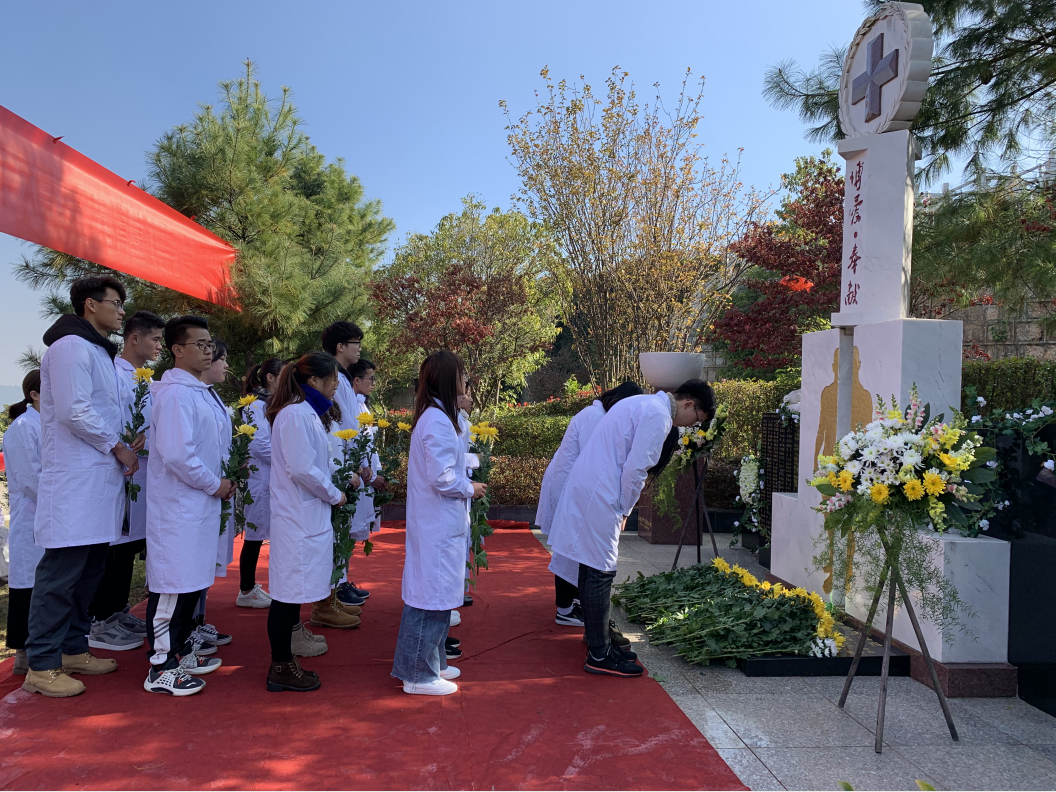 为铭记和感恩遗体捐献者的无私奉献精神,号召社会各界踊跃参与遗体捐献事业,2019年12月7日上午10时,米兰milan官方网站基础医学院联合昆明红十字会、昆明晋龙如意园等单位,以云南首座遗体捐献纪念碑建成8周年为契机,在昆明晋龙如意园举行了“2019年云南遗体捐献者冬至追思大会”。米兰milan官方网站基础医学院党委副书记彭文彬、副院长邹智荣、基础医学院人体解剖教研室全体教师、全体专职辅导员、本科学生第一、第二、第三党支部共计200余名师生参与了此次活动。