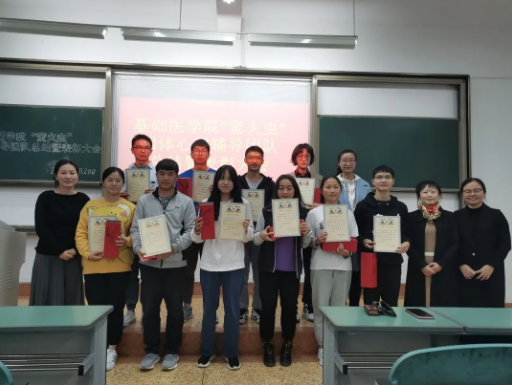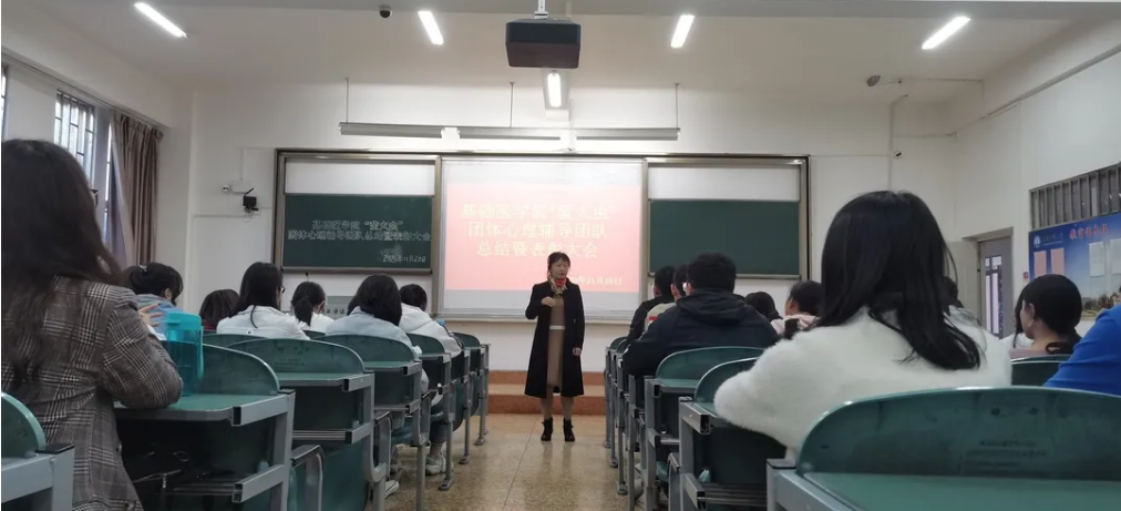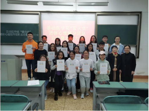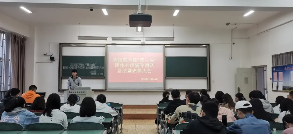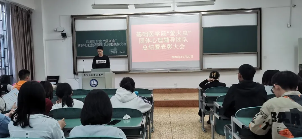 为深入贯彻落实全国高校思想政治工作会议精神,充分发挥高校心理育人作用,我院积极探索心理健康教育形式并于2020年9月-11月对我校基础、药学、口腔等十个学院的2020级的3172名同学进行了“沟通从心开始,健康与心相约”的团体心理辅导活动。此次活动由基础医学院“萤火虫”团队心理辅导团队82名同学负责具体开展,历时近两个月圆满结束。基础医学院于2020年11月20日下午5点在西苑教学楼1107教室召开了由吴晓斌、张灿雪主持的分享总结暨表彰大会,基础医学院党委副书记彭文彬老师到场指导,辅导员工作室郑福云老师、杨青青老师、晋竹筠老师以及“萤火虫”团队全体志愿者到场参加了此次会议。