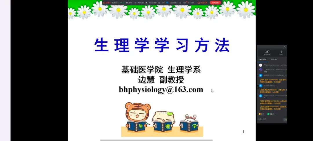 为使同学们更好的掌握生理学的学习方法及技巧,让同学们领悟到其中的奥秘。2021年10月18日,由基础医学院教学办和基础学生会联办的“生理学学习方法”线上讲座于19:30在钉钉群进行了直播。此次讲座有幸邀请到了生理学系边慧老师来向我们讲解有关生理学的学习方法与经验,2020级的五百余名同学参加了此次讲座。