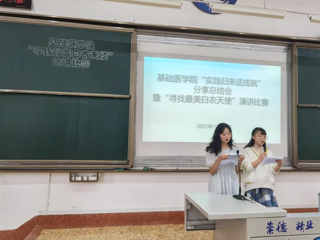 社会实践活动是大学生全面提高素质,充分发挥自身优势,服务社会和大众的重要渠道和载体。大学生只有走出校园深入社会,才能了解民情、社情和国情。为了让同学们在实践中锻炼自我,在实践中成就理想,分享社会实践收获的丰硕成果,引导医学生树立正确的理想信念,增加对医生职业的自豪感、认同感,认识作为医疗工作者所肩负的责任。2021年10月29日中午11:40,基础医学院团委学生会在西苑教学楼5104举办了2021年基础医学院“实践归来话成就”分享总结会暨“寻找最美天使”演讲比赛。本次比赛有幸邀请到学生第二党支部书记李超老师,基础医学院团委书记何浏老师,2021级年级老师王树云老师,2019级年级办主任施莹芳老师以及6名党员同学担任评委。