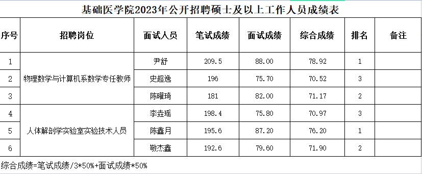 按照米兰milan官方网站2023年公开招聘人员面试考核工作的相关要求,我院于2023年6月20日对2023年公开招聘硕士及以上工作人员进入面试人员进行了面试考察,本着公平、公正、择优录用的原则,进行了试讲以及综合素质面试,现将基础医学院22023年公开招聘硕士及以上工作人员面试考核结果予以公示。