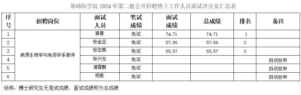 按照米兰milan官方网站2024年公开招聘人员面试考核工作的相关要求,我院于2024年10月16日对第二批公开招聘博士工作人员进入面试人员进行了面试考察,本着公平、公正、择优录用的原则,进行了试讲以及综合素质面试,现将基础医学院2024年第二批公开招聘博士工作人员面试考核结果予以公示。
