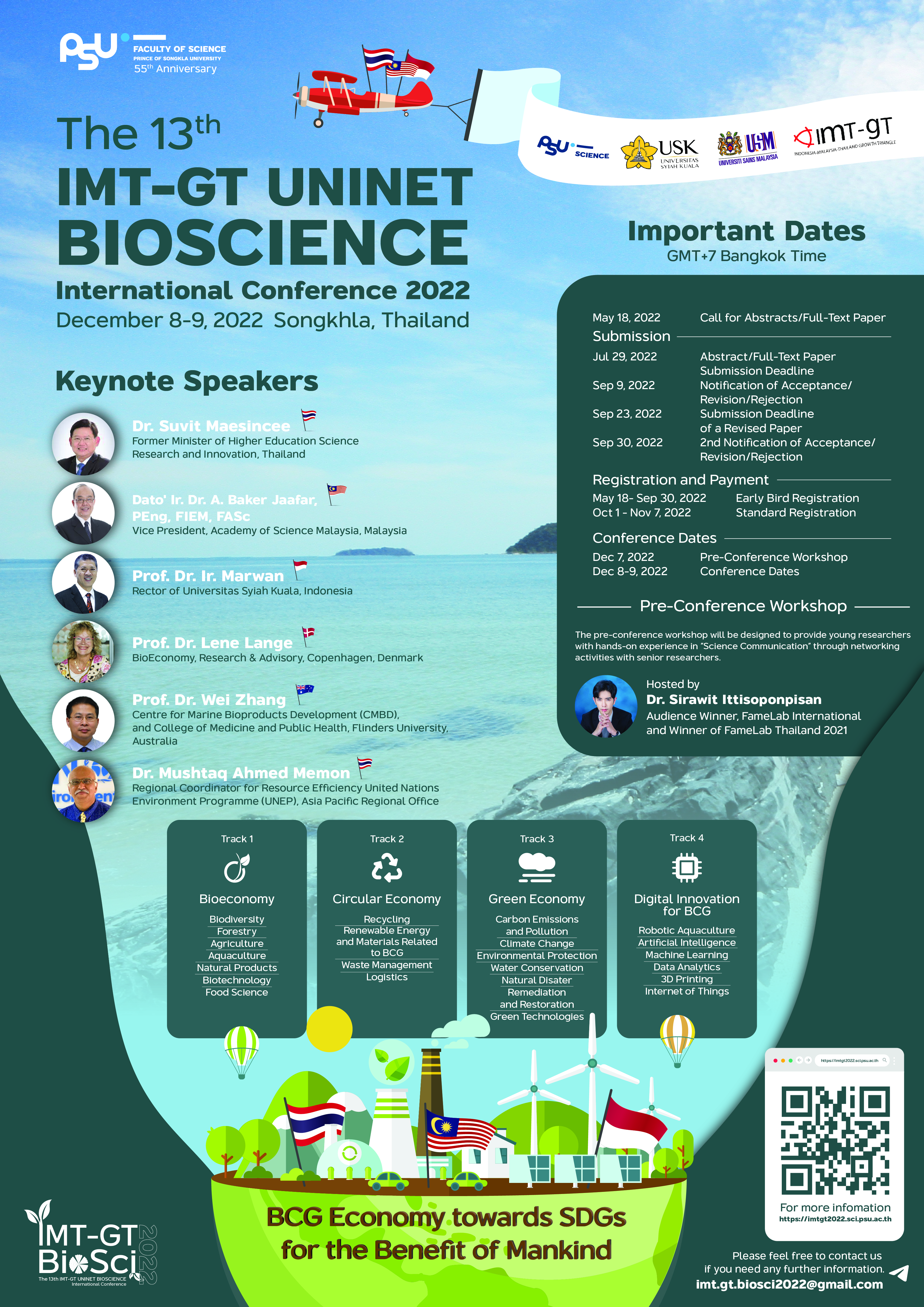 Prince of Songkla University is a member university of South and Southeast Asia Medical Education and Service Alliance. On the occasion of the upcoming 55th anniversary of the Faculty of Science, it will hold the Bioscience International Conference 2022 from 8 to 9 December 2022. If you are interested in this conference, please check the poster below to find detailed information.