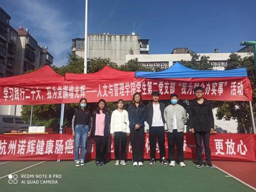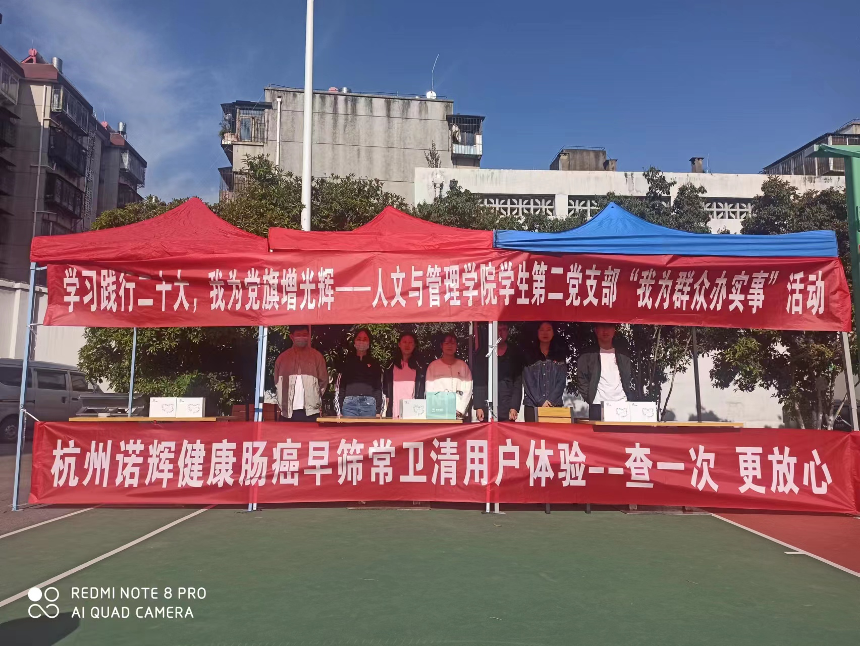 为持续巩固拓展党的二十大精神及党史学习教育成果,进一步强化党员服务意识和宗旨意识,推进民生实事计划和为民办事清单落实,切实帮助基层和广大群众解决实际困难和问题,2023年3月17日,人文与管理学院学生第二党支部以“学习践行党的二十大,我为党旗争光辉——我为群众办实事”为主题,联合杭州诺辉健康企业在平政校区和呈贡校区组织了肠癌早筛志愿服务活动。