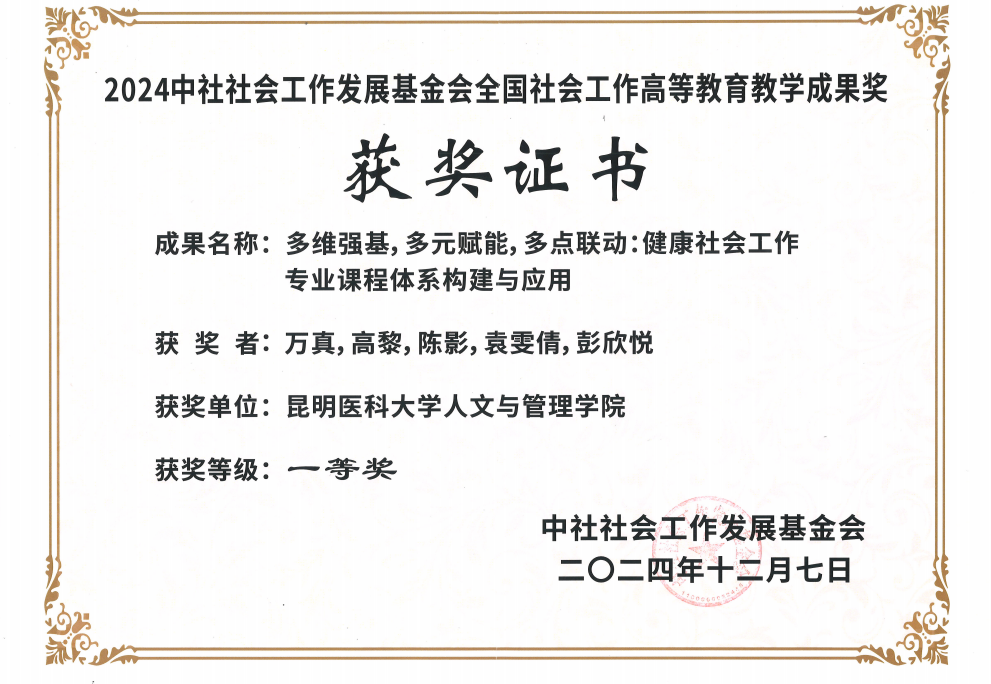 经过网络与现场的层层评选,大赛共评选出36项社会工作教育教学优秀成果,其中特等奖5项,一等奖9项,二等奖22项。米兰milan官方网站人文与管理学院社会工作专业教师团队申报的成果《多维强基,多元赋能,多点联动:健康社会工作专业课程体系构建与应用》荣获一等奖。