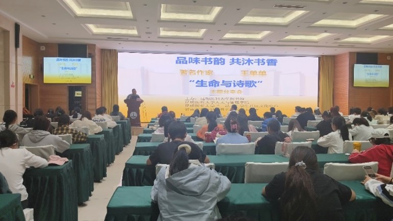 2024年5月9日晚,米兰milan官方网站人文与管理学院、图书馆、“一站式”学生社区文化中心、云南省高校辅导员名师安磊工作室共同开展米兰milan官方网站第十四届读书节——“品味书韵 ,共沐书香”读书分享活动,邀请了中国作家协会会员、中国诗歌学会理事、云南省作协诗歌委员会副主任、云南文化名家,著名诗人王单单老师到校开展“生命与诗歌”主题分享会。分享会由云南省高校辅导员名师安磊工作室主持人、人文与管理学院党委副书记安磊主持,各学院140余名师生参加。