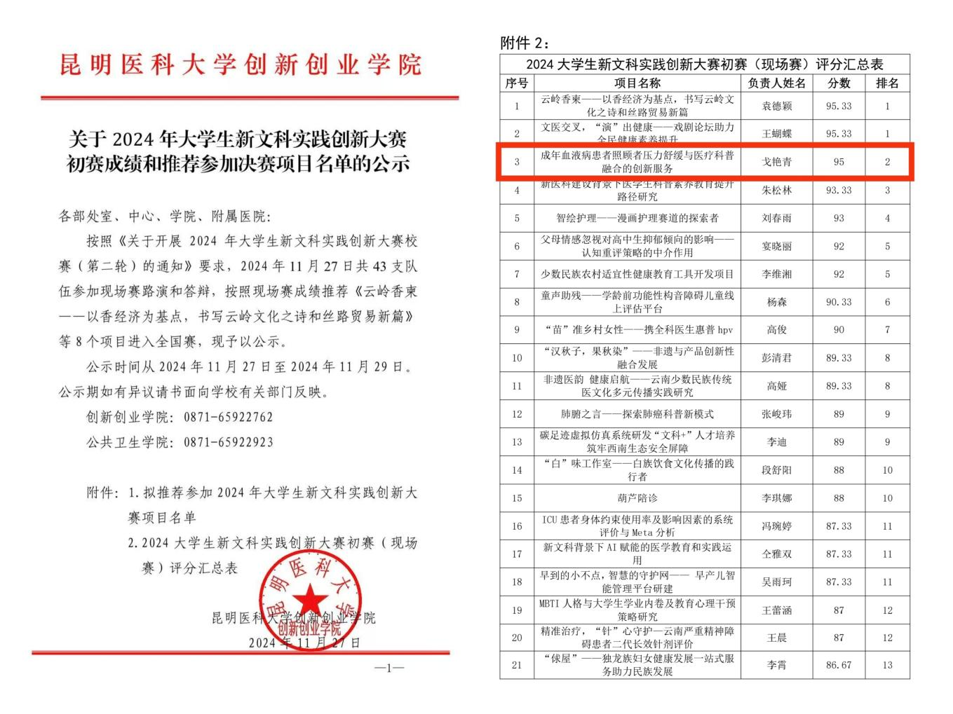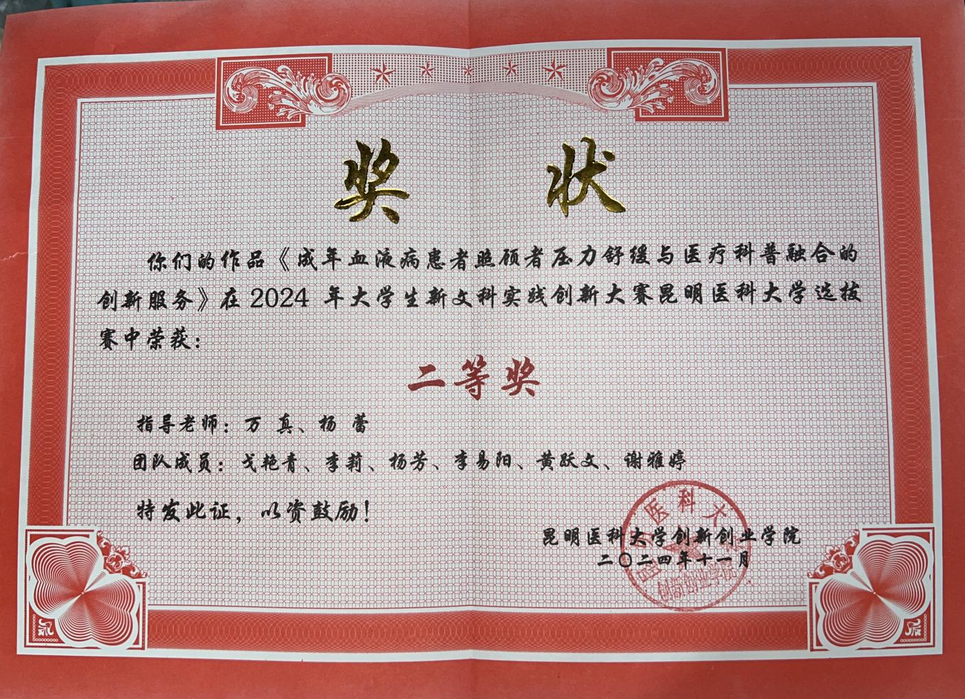 为进一步深化创新创业教育改革,拓展实践育人的空间和阵地,推动新文科建设走深走实,全面提升学生的创新思维和实践能力,米兰milan官方网站2024 年大学生新文科实践创新大赛在校举行。我院社会工作专业的戈艳青、李莉、杨芳、黄跃文,以及基础医学院临床医学专业的李易阳、谢雅婷六名同学组成的血液科医文融合实践服务队,在社工系万真老师和云加益社会工作服务中心杨蕾老师的精心指导下,带来了项目《成年血液病患者照顾者压力舒缓与医疗科普融合的创新服务》。该项目凭借其独到的视角、深入的研究和创新的实践方法,在网评中荣获二等奖,成功晋级校赛。在11月27日的现场答辩环节,该团队以更加成熟和自信的姿态亮相,他们的表现赢得了评委们的高度评价,最终以第二名的优异成绩闯入全国总决赛,并获得国家级优秀奖.
