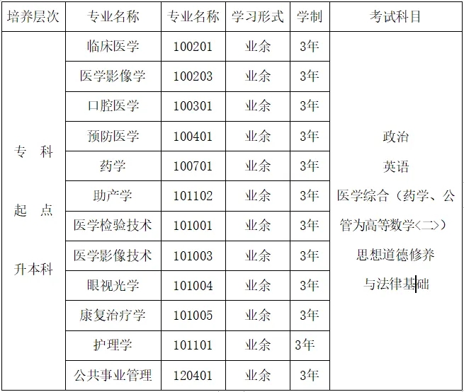 (1)报考临床医学、口腔医学、预防医学、中医学等临床类专业的人员,应当满足以下三种条件之一:①取得省级卫生健康行政部门颁发的相应类别的执业助理医师及以上资格证书;②取得国家认可的普通中专及以上相应专业学历;③取得县级及以上卫生健康行政部门颁发的乡村医生执业证书并具有中专学历或中专水平证书。