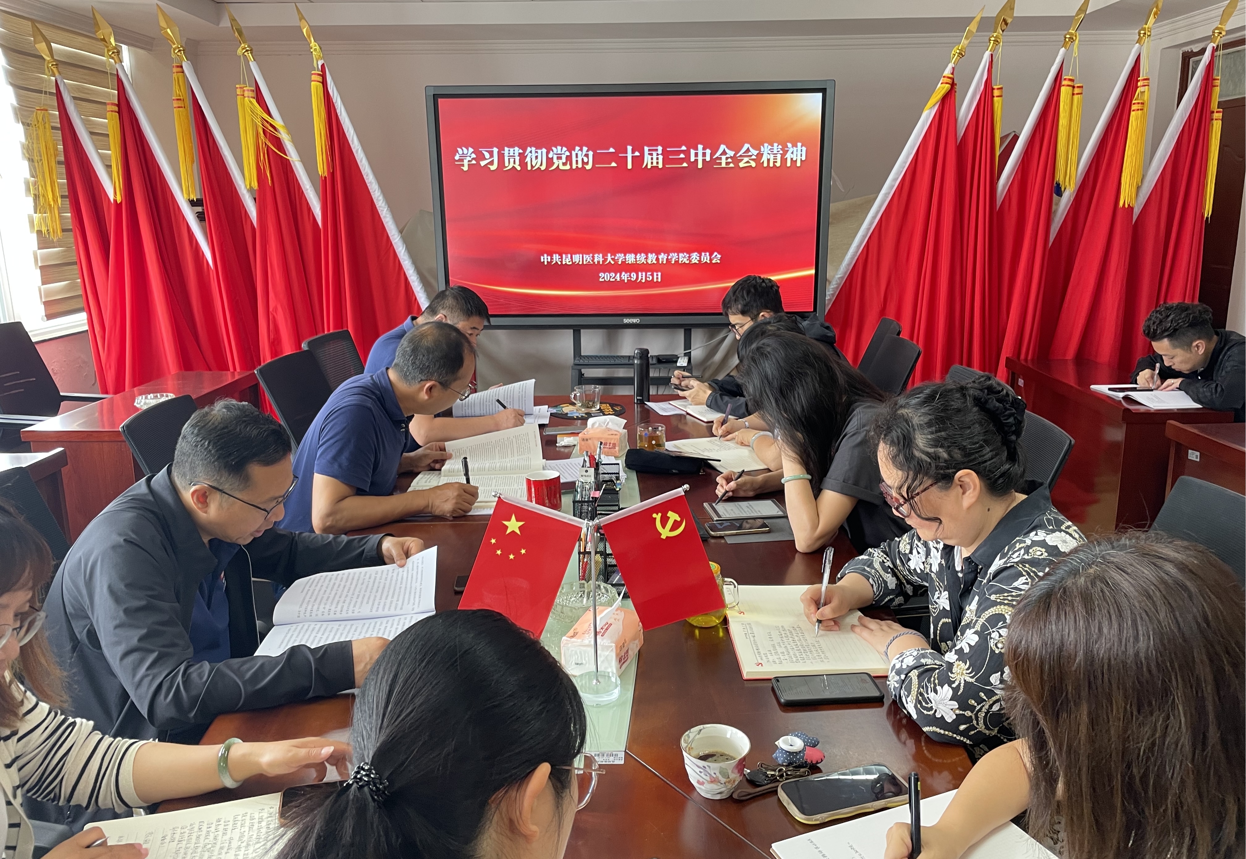 会议要求,要把学习好宣传好贯彻好党的二十届三中全会精神作为当前和今后一个时期的一项重大政治任务,认真贯彻落实党的二十届三中全会部署,牢牢把握中国式现代化的本质要求,把学习贯彻党的二十届三中全会精神与党纪学习教育成果持续转化结合起来,与学习贯彻习近平总书记考察云南重要讲话精神贯通起来,把学校的决策部署和全面深化改革要求落实到高等医学继续教育全过程、各方面;要形成“一盘棋”工作格局,学院全体党员和干部职工要把思想和行动统一到党的二十届三中全会精神上来,积极主动学、联系实际学、交流研讨学,坚持学用结合、知行合一,切实把所学所思以及互相交流的心得体会运用到实际工作中,转化为推动工作的实际行动。